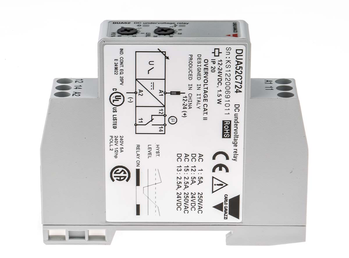 This is Voltage Monitoring Relay with SPDT Contacts 12 → 24 V dc manufactured by Carlo Gavazzi. The manufacturer part number is DUA52C724. Moreover, it has undervoltage voltage sensitivity . Additionally, its time delay is about <200ms . The given dimensions of the product include 67.2 x 17.5 x 81mm. The product is available in din rail configuration. The product has +60°c of operating temperature range. The product is offered with a minimum 8v dc sensed voltage . The product dua52, is a highly preferred choice for users. Additionally, it is designed for voltage monitoring application . It has maximum 28v dc sensed voltage . In addition, the height is 81mm. Furthermore, the product is 17.5mm wide. Its accurate length is 67.2mm. The product has a voltage sensing range about 8 → 28v dc . Whereas, the minimum operating temperature of the product is -20°c. The contact is equipped with spdt configuration. It has a maximum operating temperature of +60°c. The terminal is a screw type.