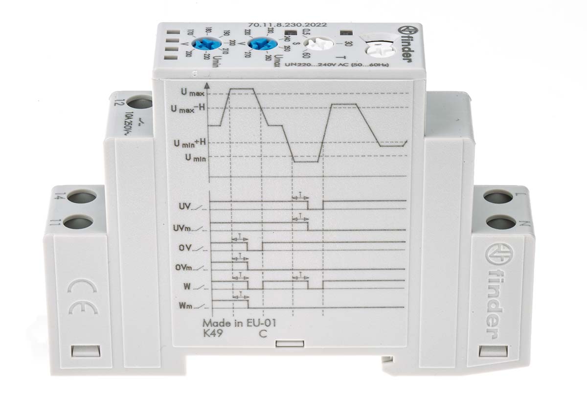 This is Voltage Monitoring Relay with SPDT Contacts 1 Phase 220 → 240 V manufactured by Finder. The manufacturer part number is 70.11.8.230.2022. Moreover, it has overvoltage protection, undervoltage protection voltage sensitivity . The given dimensions of the product include 60.8 x 17.5 x 88.8mm. It has about -20 → +60°c temperature sensing range . The product has a voltage sensing range about 170 → 270v ac . Furthermore, the product is 17.5mm wide. Additionally, it has about 50 → 60hz frequency sensing range . Its electrical phase configuration includes 1. The product complies with all safety standards, such as ce, eac. Moreover, it has a maximum 10a sensed current . It has a maximum operating temperature of +60°c. Its typical current range is 10a . Additionally, its time delay is about 0.5 → 60s . The product has +60°c of operating temperature range. Additionally, it is designed for voltage monitoring application . It has maximum 270v ac sensed voltage . The contact is equipped with spdt configuration. Its accurate length is 88.8mm. The product 70, is a highly preferred choice for users. In addition, the height is 60.8mm. Whereas, the minimum operating temperature of the product is -20°c. It has equipped with 1 poles.