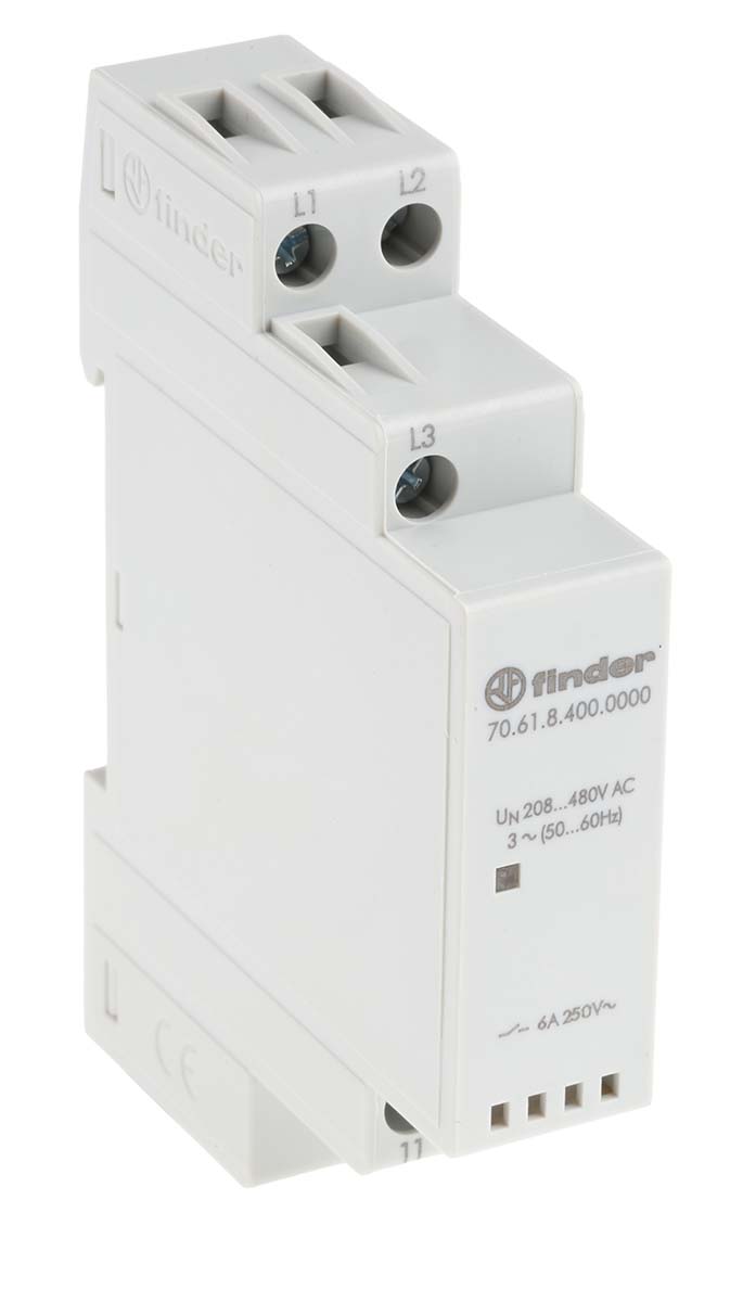 This is Voltage Monitoring Relay with SPDT Contacts 3 Phase 208 → 480 V manufactured by Finder. The manufacturer part number is 70.61.8.400.0000. Its typical current range is 6a . Additionally, its time delay is about 0.5s . The given dimensions of the product include 60.8 x 17.5 x 87mm. The product is available in din rail configuration. It has about -20 → +60°c temperature sensing range . The product 70, is a highly preferred choice for users. Additionally, it is designed for voltage monitoring application . The product has +60°c of operating temperature range. In addition, the height is 60.8mm. Furthermore, the product is 17.5mm wide. Its accurate length is 87mm. It has phase loss, phase sequence sensitivity . Whereas, the minimum operating temperature of the product is -20°c. Its electrical phase configuration includes 3. It has a maximum operating temperature of +60°c. The contact is equipped with spdt configuration. It has equipped with 1 poles. The terminal is a screw type. Additionally, it has about 50 → 60hz frequency sensing range .
