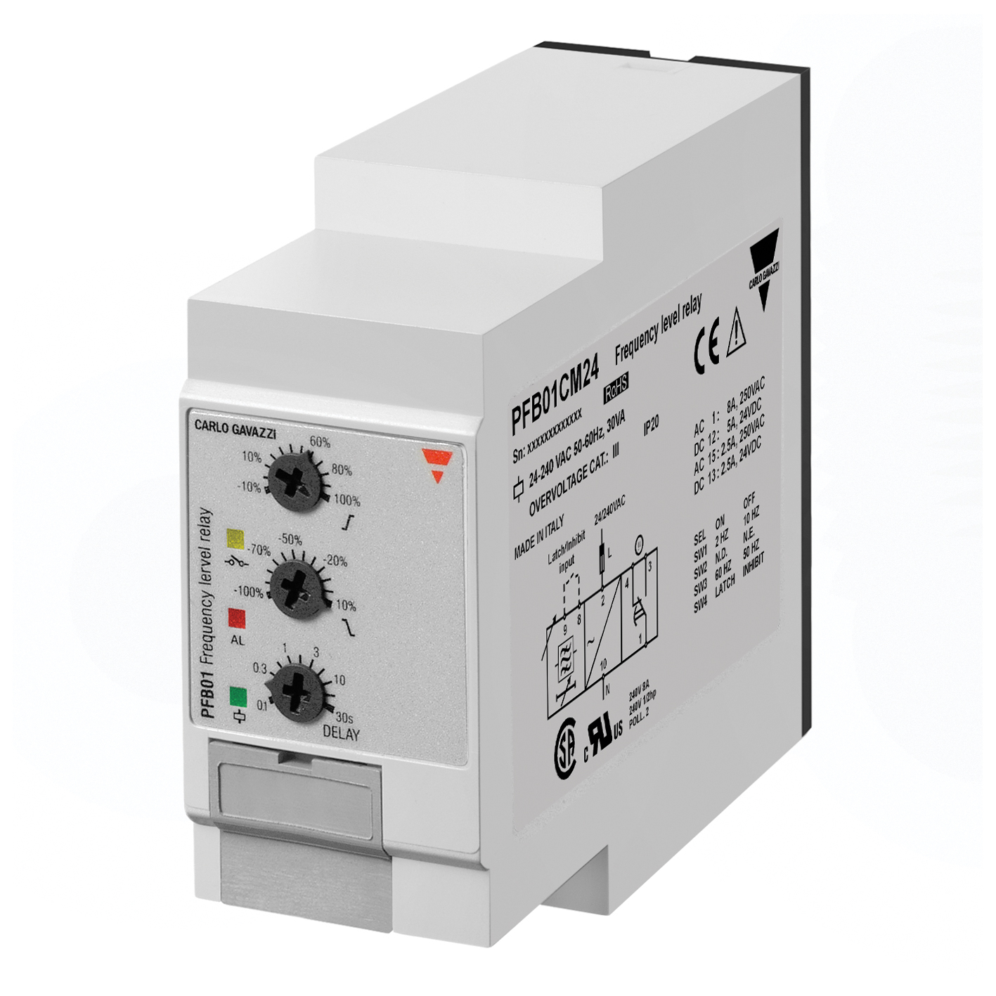 This is Frequency Monitoring Relay with SPDT Contacts 24 → 240 V ac manufactured by Carlo Gavazzi. The manufacturer part number is PFB01CM24. Additionally, it is designed for frequency monitoring application . The product has a voltage sensing range about 24 → 240v ac . The product is available in din rail configuration. The contact is equipped with spdt configuration.