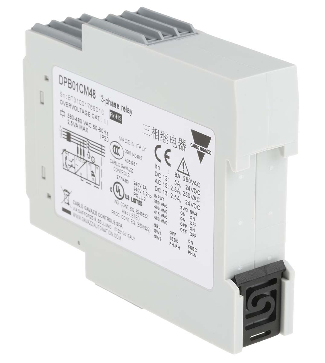 This is Phase Voltage Monitoring Relay with SPDT Contacts 3 3+N Phase 380 → 480 V ac manufactured by Carlo Gavazzi. The manufacturer part number is DPB01CM48. Moreover, it has overvoltage, undervoltage voltage sensitivity . Additionally, its time delay is about 1 s, 6s . The given dimensions of the product include 99.5 x 22.5 x 80mm. The product is available in din rail configuration. The product has +60°c of operating temperature range. The product is offered with a minimum 323v ac sensed voltage . The product dpb01, is a highly preferred choice for users. Additionally, it is designed for phase, voltage monitoring application . It has maximum 550v ac sensed voltage . In addition, the height is 80mm. Furthermore, the product is 22.5mm wide. Its accurate length is 99.5mm. The product has a voltage sensing range about 323 → 550v ac . It has phase loss, phase sequence sensitivity . Whereas, the minimum operating temperature of the product is -20°c. Its electrical phase configuration includes 3, 3+n. The contact is equipped with spdt configuration. It has a maximum operating temperature of +60°c. The terminal is a screw type.