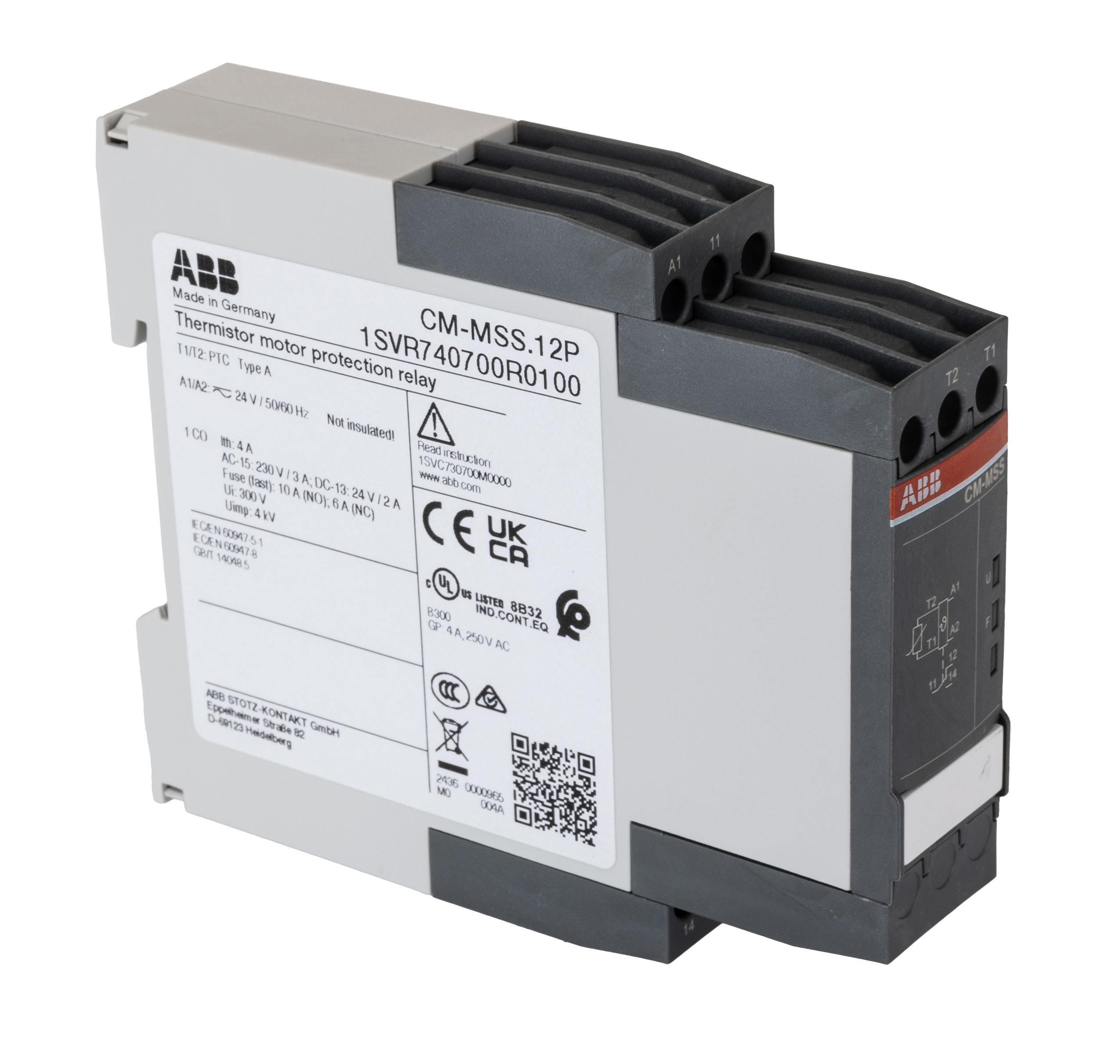 This is Temperature Monitoring Relay With SPDT Contacts manufactured by ABB. The manufacturer part number is 1SVR740700R0100 CM-MSS.12P. In addition, it has overtemperature, winding temperature temperature sensitivity . Its typical current range is maximum of 3.7ma . Additionally, its time delay is about <100ms . The given dimensions of the product include 103.7 x 22.5 x 85.6mm. The product is available in din rail configuration. The product has +60°c of operating temperature range. The product cm-mss, is a highly preferred choice for users. Additionally, it is designed for temperature monitoring application . In addition, the height is 85.6mm. Furthermore, the product is 22.5mm wide. Its accurate length is 103.7mm. Whereas, the minimum operating temperature of the product is -25°c. It has a maximum operating temperature of +60°c. The product also provides special features, such as automatic reset, fail-safe, inbuilt ptc sensor, insufficient cooling protection, one measuring circuit, over heating protection, over load protection. The contact is equipped with spdt configuration. It has equipped with 1 poles. The terminal is a cage clamp type.