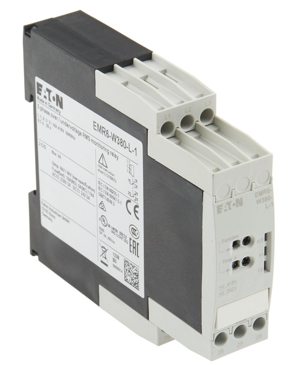This is Phase Voltage Monitoring Relay manufactured by Eaton. The manufacturer part number is 184777 EMR6-W380-L-1. Moreover, it has overvoltage, undervoltage voltage sensitivity . Additionally, its time delay is about 0.1 → 30s . The given dimensions of the product include 109.5 x 22.5 x 78mm. The product is available in din rail configuration. The product has +60°c of operating temperature range. It has a minimum 50hz frequency sensed . Additionally, it is designed for phase, voltage monitoring application . Whereas, the minimum operating temperature of the product is -25°c. It has maximum 380v ac sensed voltage . In addition, the height is 78mm. Furthermore, the product is 22.5mm wide. Its accurate length is 109.5mm. It has phase failure, phase sequence sensitivity . With 60hz maximum frequency sensed . It has a maximum operating temperature of +60°c. The terminal is a screw type. Additionally, it has about 50 → 60hz frequency sensing range .
