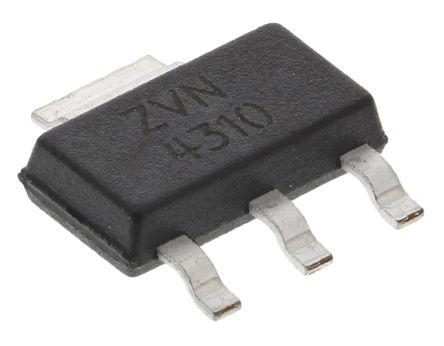 This is Diodes Inc N-channel MOSFET 1.67 A 100 V 3+Tab-Pin SOT-223 manufactured by DiodesZetex. The manufacturer part number is ZVN4310GTA. It has a maximum of 100 v drain source voltage. The product is available in surface mount configuration. The product carries enhancement channel mode. Provides up to 3 w maximum power dissipation. It features a maximum gate source voltage of -20 v, +20 v. The product carries 3v of maximum gate threshold voltage. In addition, the height is 1.65mm. Furthermore, the product is 3.7mm wide. Its accurate length is 6.7mm. It provides up to 540 mω maximum drain source resistance. The package is a sort of sot-223. It consists of 1 elements per chip. Whereas, the minimum operating temperature of the product is -55 °c. While 1.67 a of maximum continuous drain current. The transistor is manufactured from highly durable si material. The product is available in [Cannel Type] channel. It has a maximum operating temperature of +150 °c. It contains 3 + tab pins. The product offers single transistor configuration.