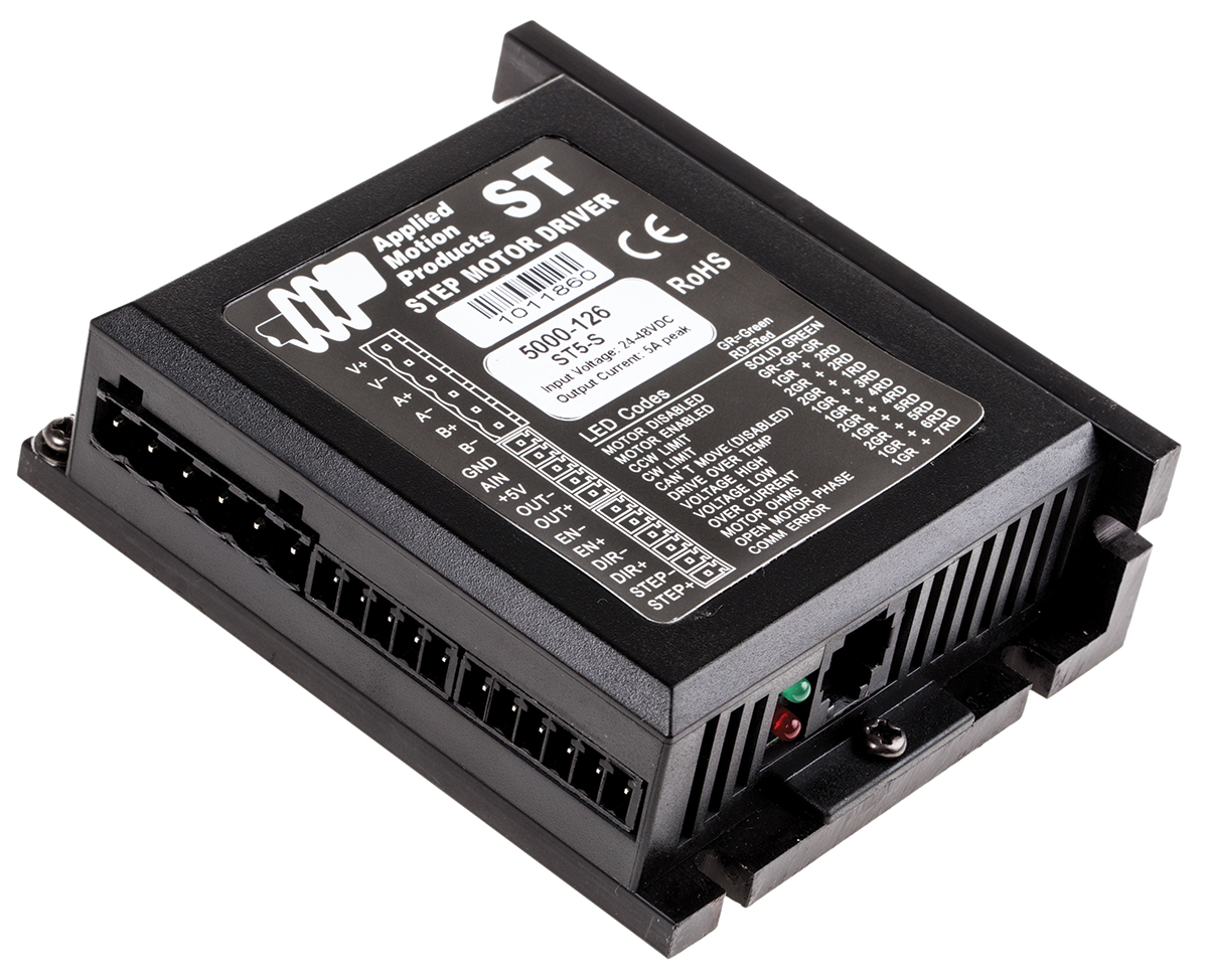 This is 5 A Bipolar Stepper Drive 24 → 48V dc 3.65 x 3 x 1.125in manufactured by Applied Motion Systems. The manufacturer part number is ST5-S. Similarly, the product has 32mm of overall depth. It has an overall width of 76mm. The product has a current rating of 5 a. It has an overall length of 93mm.