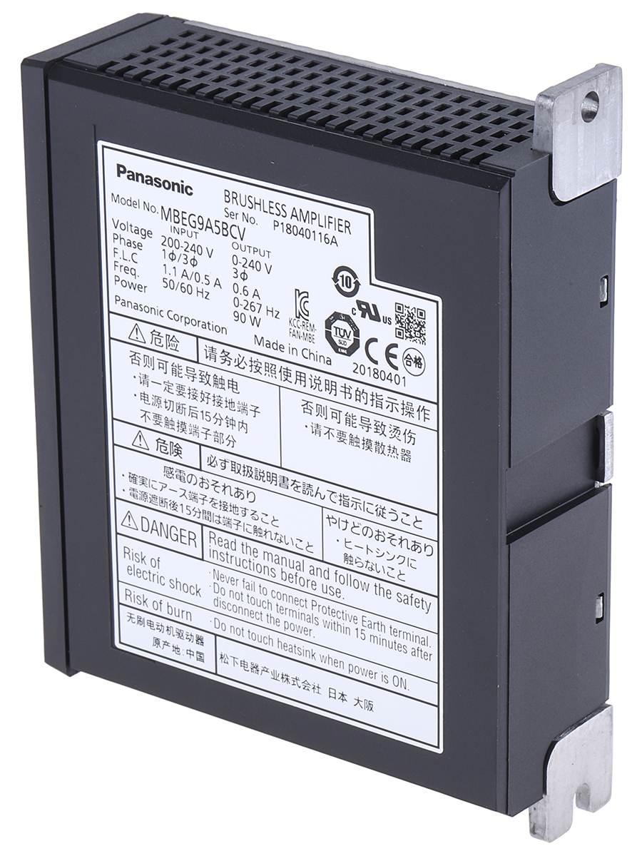 This is 90 W PWM Speed Controller Servo Drive 1.1 A 500 mA 200 → 240 V ac 0 → +50 °C manufactured by Panasonic. The manufacturer part number is MBEG9A5BCV. The product has a current rating of 1.1 a, 500 ma. Moreover, the product has a nominal 240 v ac voltage rating. It has an overall width of 105mm. Features 200 <arrow/> 240 v supply voltage. Whereas, the minimum operating temperature of the product is 0°c. It has an overall length of 120mm. Concerning phase options, it features 1, 3 configuration. Similarly, the product has 35mm of overall depth. Feature 90 w of power rating. It has a maximum operating temperature of +50°c. Additionally, it has a/an pwm, speed controller control function .