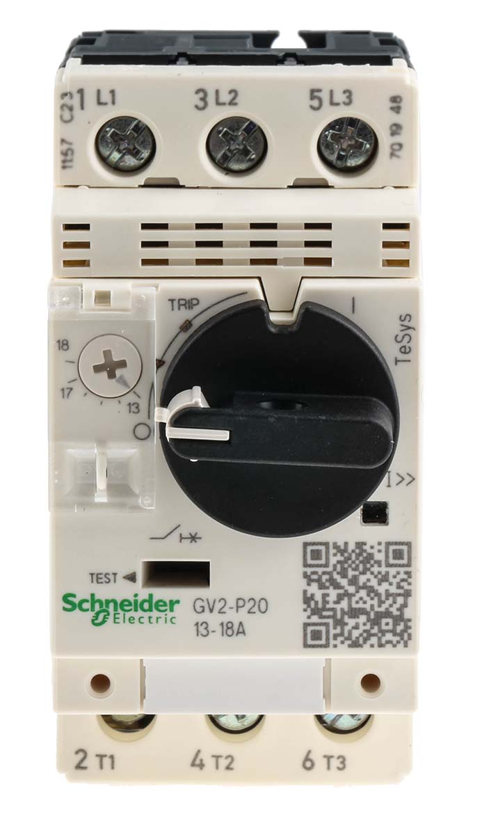 The Schneider Electric TeSys GV2P20 is a highly efficient 3-pole motor protection circuit breaker (MPCB) engineered for reliable motor starting and stopping, while providing complete protection against overloads and short circuits. This TeSys range component offers a thermal-magnetic trip unit with an adjustable current rating of 13 to 18 A, suitable for motors up to 690 V ac. Its robust design and 4 kA breaking capacity ensure motor integrity and system safety, making it an essential component for any motor control solution.