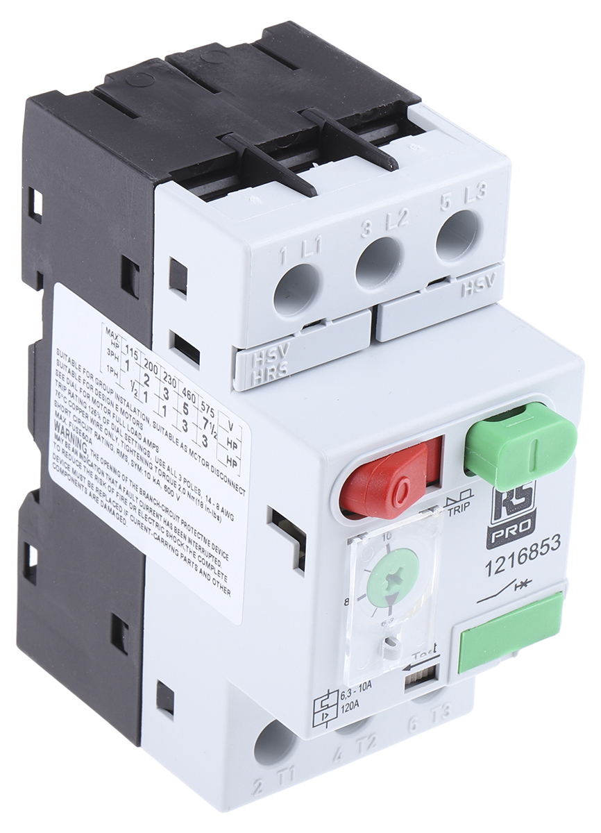 This is 690 V Motor Protection Switch 3P 6.3 → 10 A 100 kA @ 230 V manufactured by RS Pro. The manufacturer part number is 121-6853. The product has a current rating of 6.3 → 10 a. The product ms32, is a highly preferred choice for users. It has an overall width of 89.5mm. It includes circuit breaker as motor protection component . It has an overall length of 45mm. Similarly, the product has 78.5mm of overall depth.