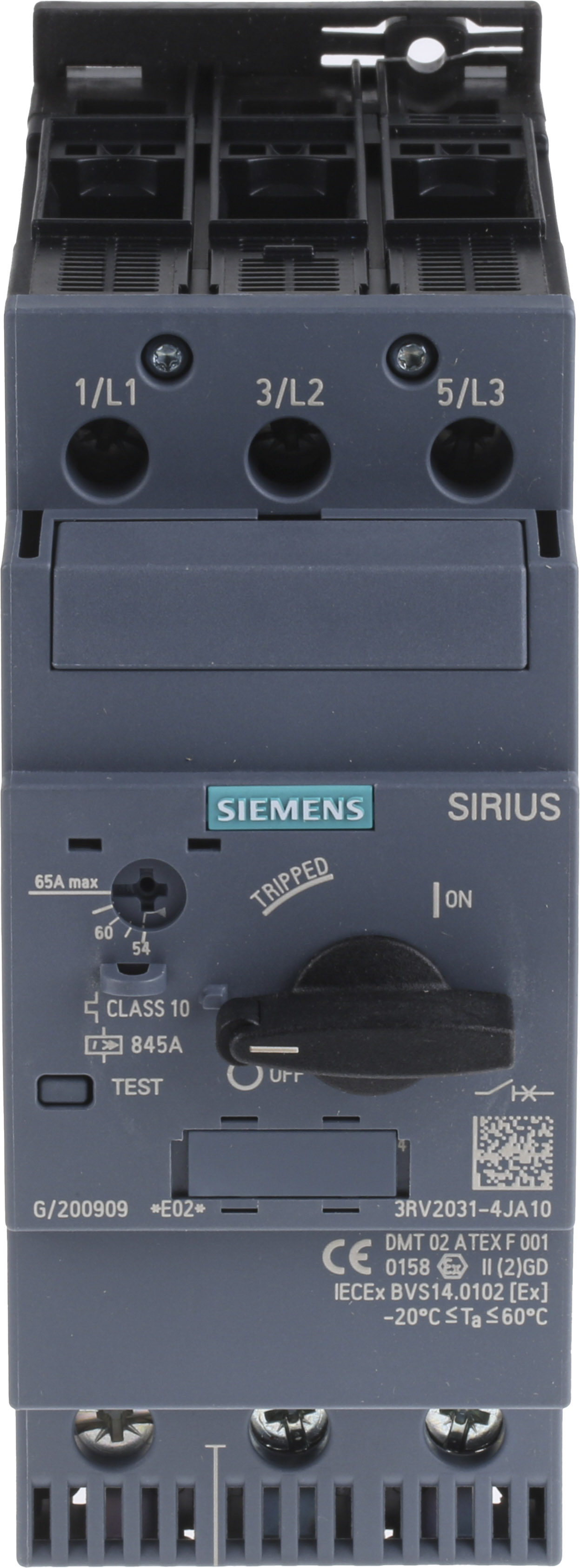 The Siemens 3RV2031-4JA10 Motor Protection Circuit Breaker is a high-performance, three-pole device engineered for the rigorous protection of industrial electric motors. As a key component of the highly regarded SIRIUS 3RV modular system, this circuit breaker offers dual-purpose protection against catastrophic damage from short circuits and thermal stress from overloads. The device boasts an adjustable current setting from 54 A to 65 A, enabling precise matching to the specific motor requirements. Furthermore, its impressive 65 kA breaking capacity ensures it can safely interrupt even extremely high fault currents.