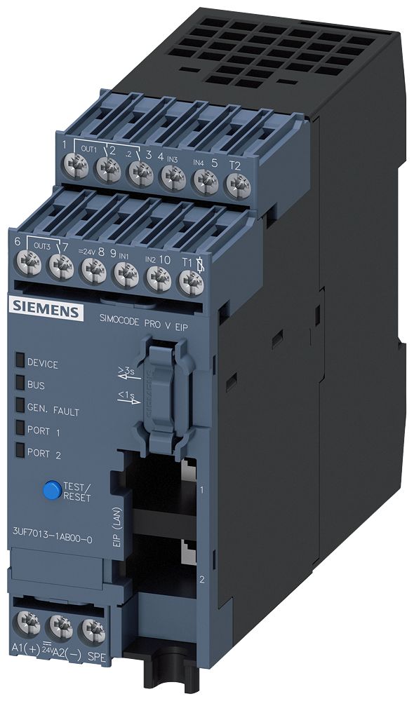 This is 6 SIRIUS Motor Controller 240 V manufactured by Siemens. The manufacturer part number is 3UF7013-1AB00-0. The product has a current rating of 6 a. The product consists of 4 inputs. It includes basic unit as motor protection component . It features sirius range. Features 240 v supply voltage. It has a/an simocode pro v eip motor protection system . Moreover, the product allow the output of 3.