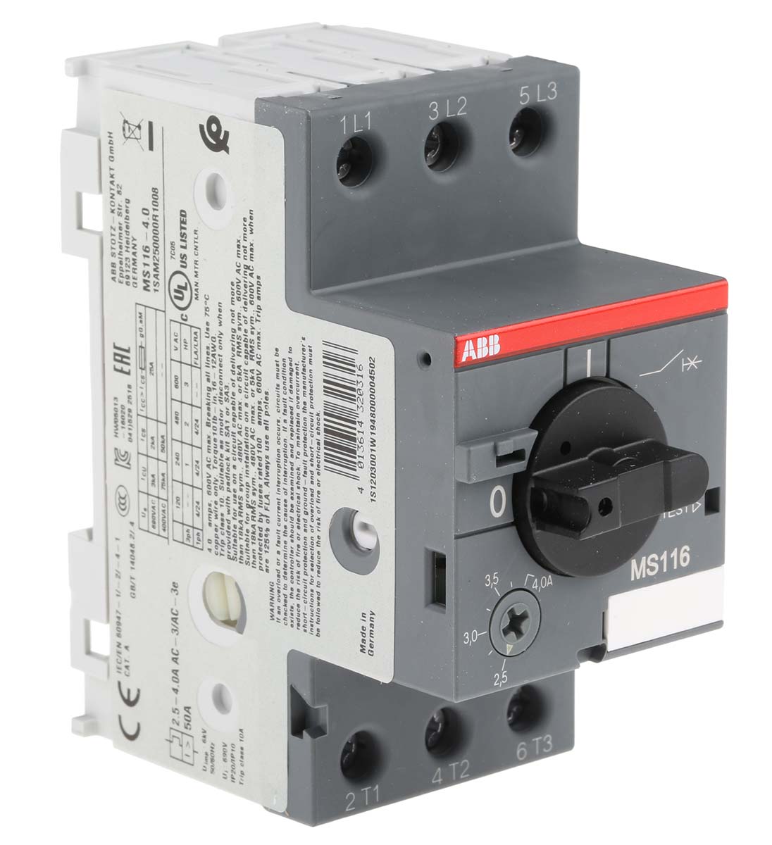 This is 690 V ac Motor Protection Circuit Breaker - 3P Channels manufactured by ABB. The manufacturer part number is 1SAM250000R1008 MS116-4.0. The product has a current rating of 4 a. Moreover, the product has a nominal 690 v voltage rating. The product ms116, is a highly preferred choice for users. It has an overall width of 45mm. It includes circuit breaker as motor protection component . It features 18 ka breaking capacity. Features 690 v supply voltage. Whereas, the minimum operating temperature of the product is -25°c. It has an overall length of 90mm. Similarly, the product has 80.1mm of overall depth. It has a maximum operating temperature of +55°c. It has equipped with 3 poles. The terminal is a screw type.