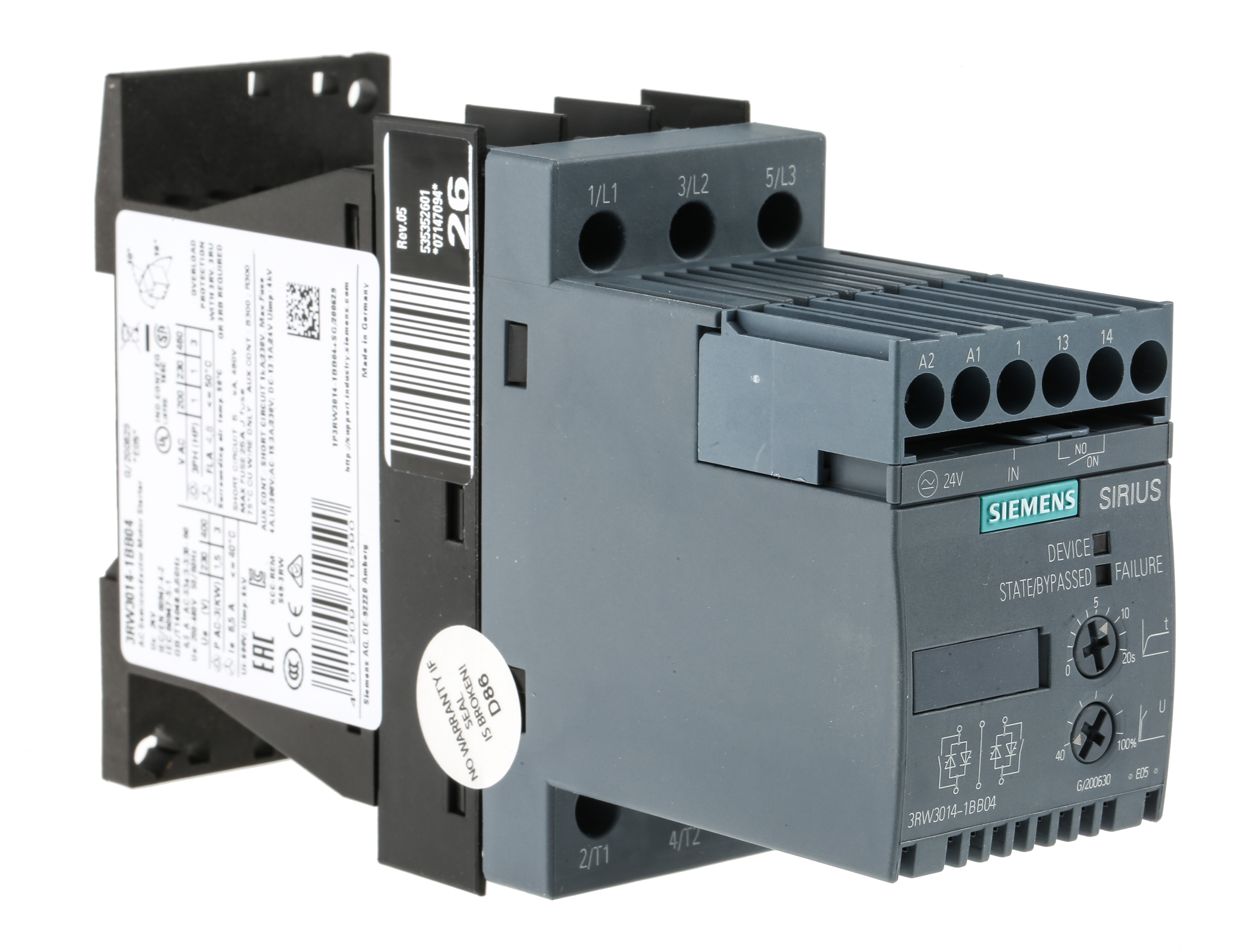 This is 6.5 A Soft Starter 3RW30 Series IP20 3 kW manufactured by Siemens. The manufacturer part number is 3RW3014-1BB04. Is it a better world product? yes. The product has a current rating of 6.5 a. The product complies with all safety standards, such as ccc certified, ce certified, csa certified, eac certified, ul listed. It is IP rated with ip20. The product 3rw30, is a highly preferred choice for users. It has an overall width of 45mm. Moreover, the product has a nominal 480 v ac voltage rating. It has a standard soft start type motor starter . It features sirius 3rw range. It has an overall length of 151mm. Concerning phase options, it features 3 configuration. Similarly, the product has 95mm of overall depth. Feature 3 kw of power rating. It has equipped with 3 poles.