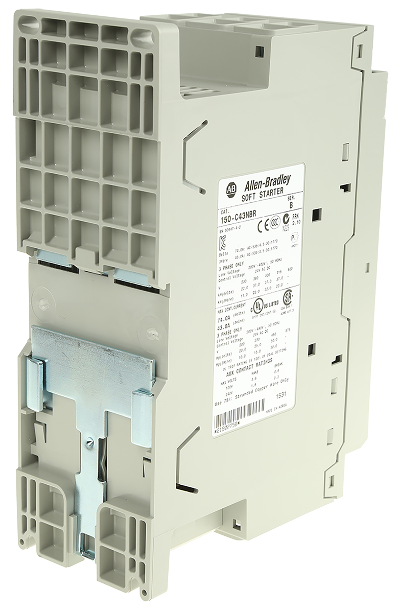 This is 43 A Soft Starter SMC-3 Series IP2X 22 kW 200 → 460 V ac manufactured by Allen Bradley. The manufacturer part number is 150-C43NBR. The product has a current rating of 43 a. It is IP rated with ip2x. The product smc-3, is a highly preferred choice for users. It has an overall width of 72mm. Moreover, the product has a nominal 460 v ac voltage rating. It has a standard soft start type motor starter . It has an overall length of 130mm. Concerning phase options, it features 3 configuration. Similarly, the product has 206mm of overall depth. Feature 22 kw of power rating.