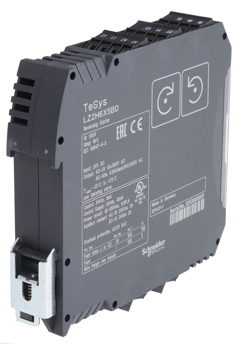 This is TeSys 3 kW Reverse Starter 24 V dc 1.5 → 6.5 A manufactured by Schneider Electric. The manufacturer part number is LZ2H6X5BD. Better World Verification Options - green premium. Is it a better world product? yes. The product complies with all safety standards, such as atex, ce, culus, iec 60947-4-2, ul 60947-4-1. The product is available in din rail configuration. The product tesys h, is a highly preferred choice for users. It has an overall width of 22.5mm. It has a standard reversing type motor starter . It features tesys range. Similarly, the product has 114.5mm of overall depth. Feature 3 kw of power rating. The product has -25°c ~ 70°c operating temperature range. This high-efficiency motor is a ac motor. It comes in module configuration. While, the output current includes 6.5a. The schneider electric's product offers user-desired applications. The given watts of the product include 3000 w. Furthermore, it is a type of motor starter, reversible Control/Drive type. It has a long 5 weeks standard lead time. The product tesys, is a highly preferred choice for users. The given load voltage is 500v. In addition, box is the available packaging type of the product. It has optimum voltage supply of 24vdc. The product consists of 1 motors.