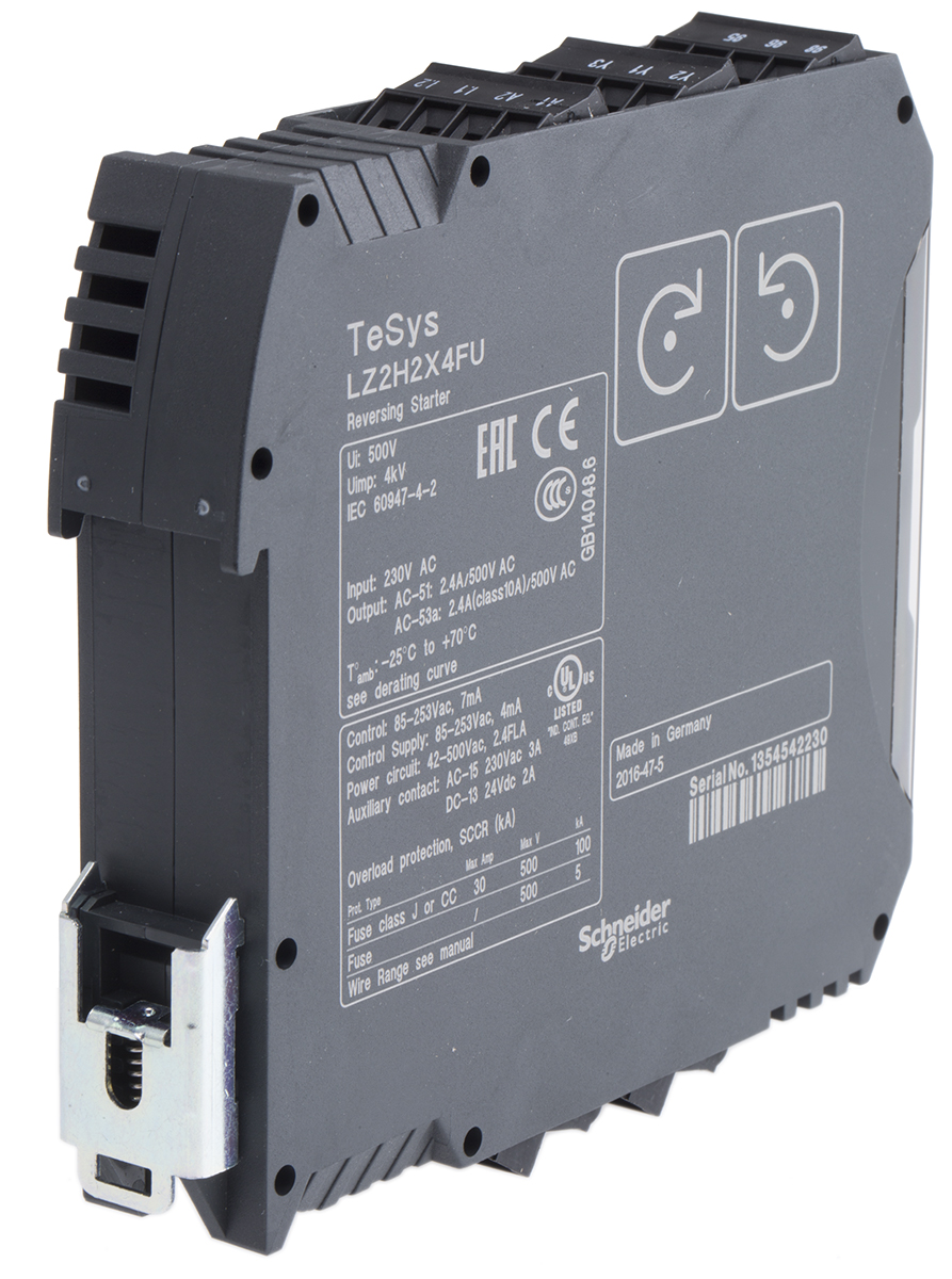 This is TeSys 1.1 kW Reverse Starter 110 → 230 V ac 0.18 → 2.4 A manufactured by Schneider Electric. The manufacturer part number is LZ2H2X4FU. Better World Verification Options - green premium. Is it a better world product? yes. The product complies with all safety standards, such as atex, ce, culus, iec 60947-4-2, ul 60947-4-1. The product is available in din rail configuration. The product tesys h, is a highly preferred choice for users. It features tesys range. Feature 1.1 kw of power rating.