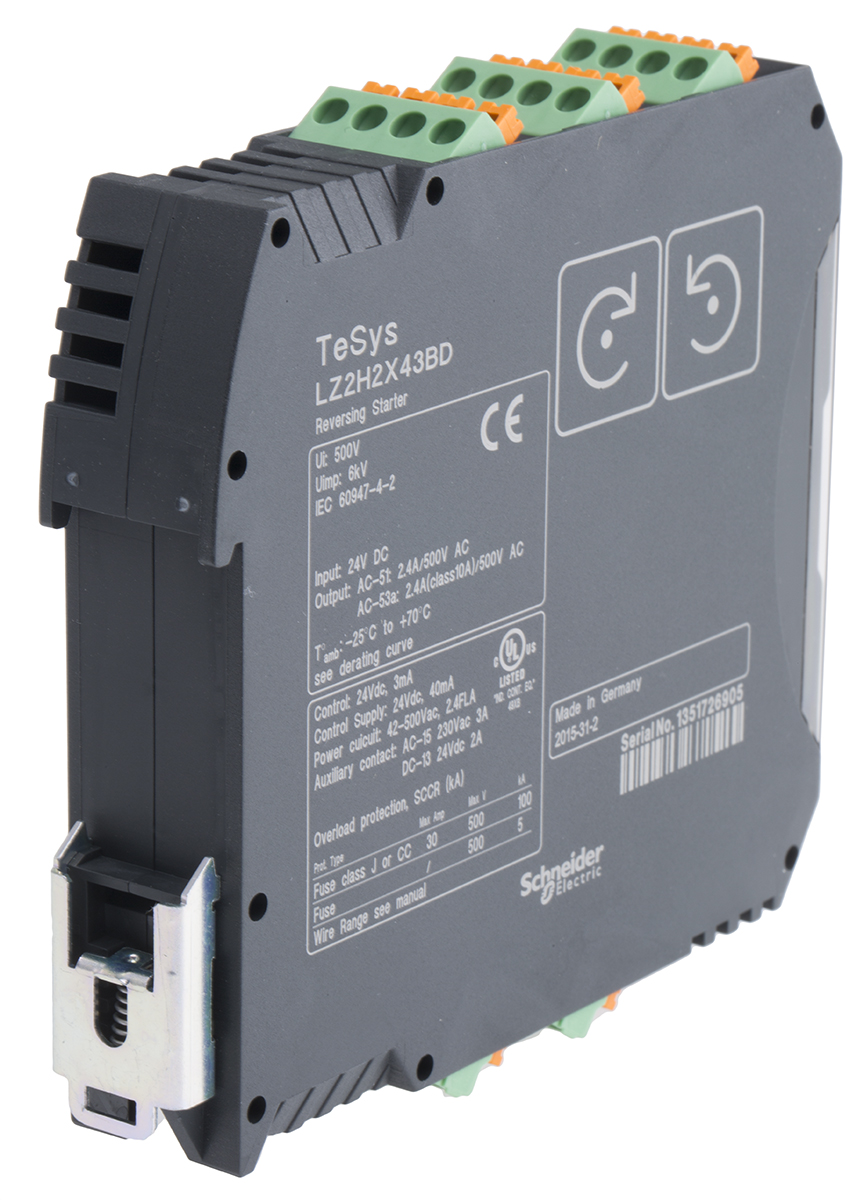This is TeSys 1.1 kW Reverse Starter 24 V dc 0.18 → 2.4 A manufactured by Schneider Electric. The manufacturer part number is LZ2H2X43BD. Better World Verification Options - green premium. Is it a better world product? yes. The product complies with all safety standards, such as atex, ce, culus, iec 60947-4-2, ul 60947-4-1. The product is available in din rail configuration. The product tesys h, is a highly preferred choice for users. It features tesys range. Feature 1.1 kw of power rating.