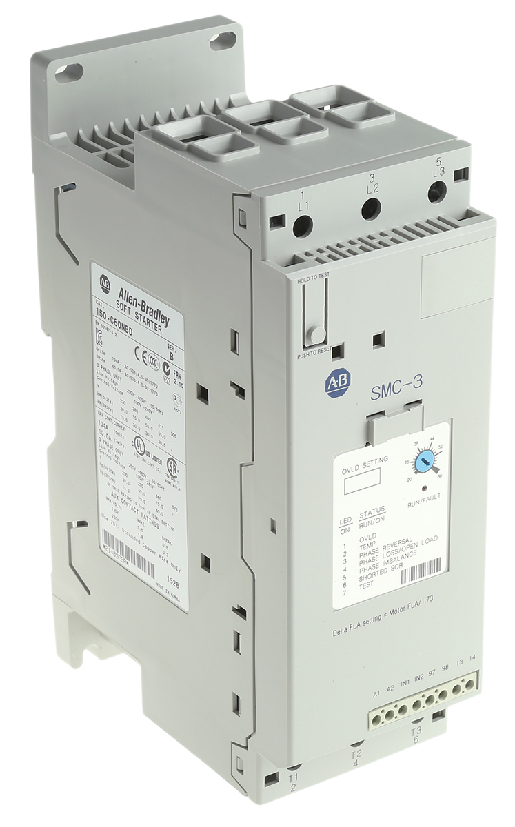 This is 60 A Soft Starter SMC-3 Series IP2X 30 kW 200 → 460 V ac manufactured by Allen Bradley. The manufacturer part number is 150-C60NBD. The product has a current rating of 60 a. It is IP rated with ip2x. The product smc-3, is a highly preferred choice for users. It has an overall width of 72mm. Moreover, the product has a nominal 460 v ac voltage rating. It has a standard soft start type motor starter . It has an overall length of 130mm. Concerning phase options, it features 3 configuration. Similarly, the product has 206mm of overall depth. Feature 30 kw of power rating.