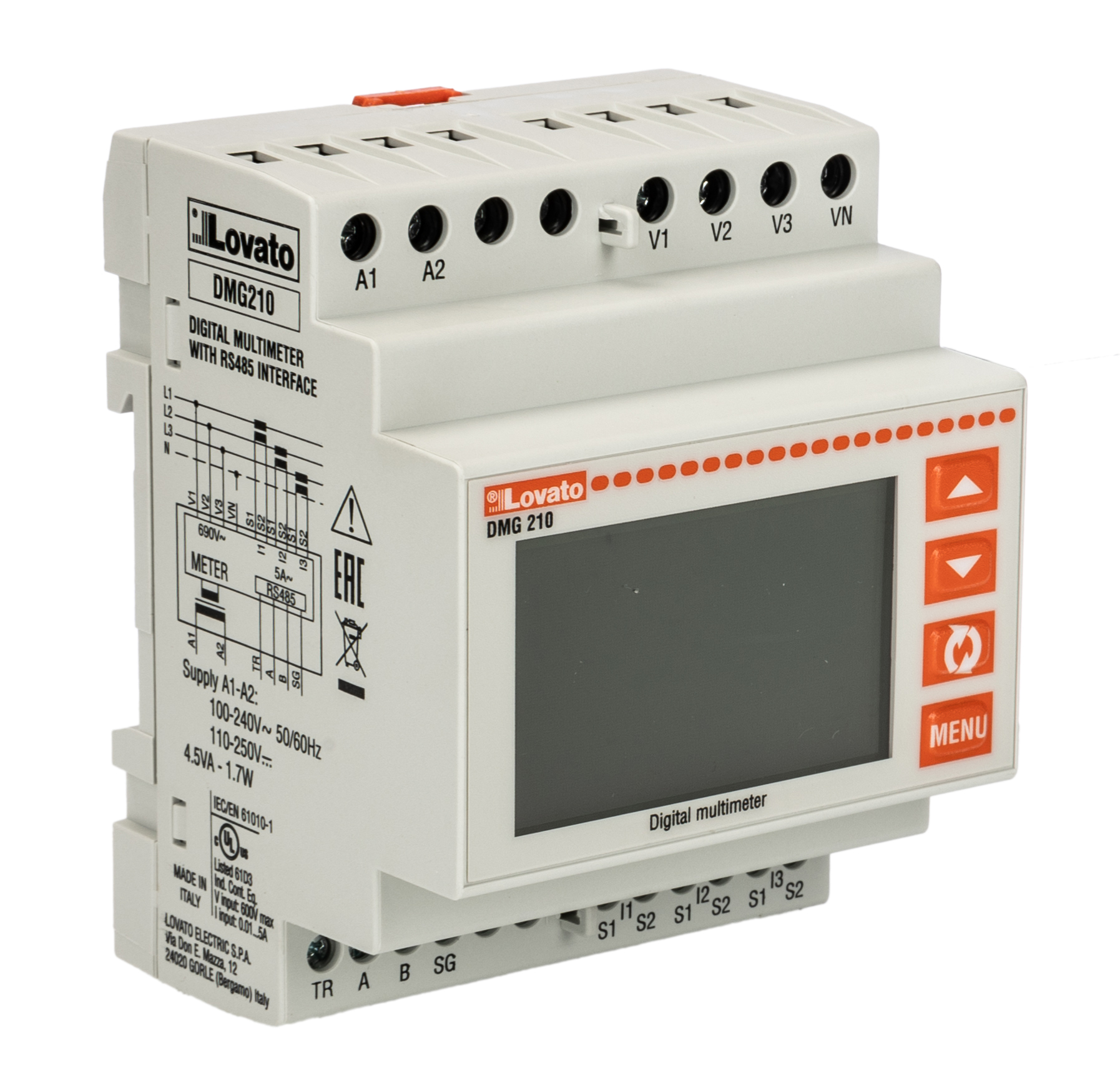 This is LCD Digital Panel Multi-Function Meter for Current Frequency Power Power Factor Voltage manufactured by Lovato. The manufacturer part number is DMG210. It features a remarkable lcd display. A bespoke product is a robust electronic meter with various applications. It has a minimum 10 (neutral) v ac, 20 (phase → phase) v ac measurement capacity . The product dmg, is a highly preferred choice for users. Its measurement range is 10 → 480 (neutral) v ac, 20 → 830 (phase → phase) v ac, 45 → 66 hz, maximum of 10000 a . The product comes in 63mm depth. The product has +60°c maximum temperature. The product complies with csa, culus certification, eac certification. While its minimum temperature is -20°c.
