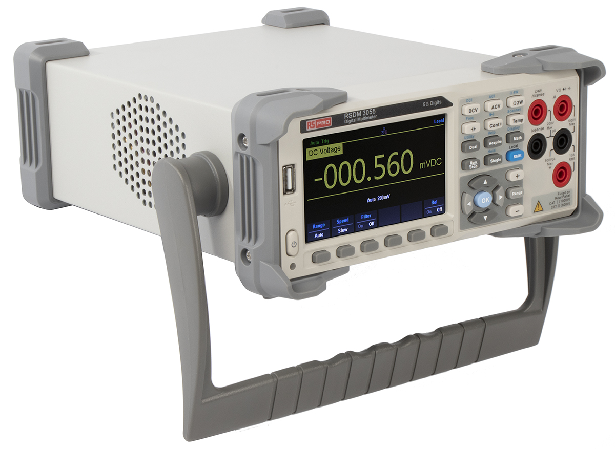 This is RSDM3055 Bench Digital Multimeter 10A ac 750V ac 10A dc 1000V dc manufactured by RS Pro. The manufacturer part number is 123-6465. Its safety category voltage is 1000v . Moreover, the product gets power from mains. Furthermore, the product is 260 mm wide. It has a True RMS feature yes . It has a model number rsdm3055. It features 1mhz of maximum frequency. multimeter is a versatile product designed to provide user-defined applications. Moreover, its safety category level is cat ii, cat i . The product has a maximum 100mω resistance measurement . Its accurate length is 282mm. It features a remarkable digital display. The typical product's weight is 3.3kg. It has a standard bench type multimeter . In addition, the height is 105mm. Moreover, it has an resistance, ac current, capacitance, frequency, dc voltage, dc current, temperature, diode, ac voltage, period, continuity functions measured .