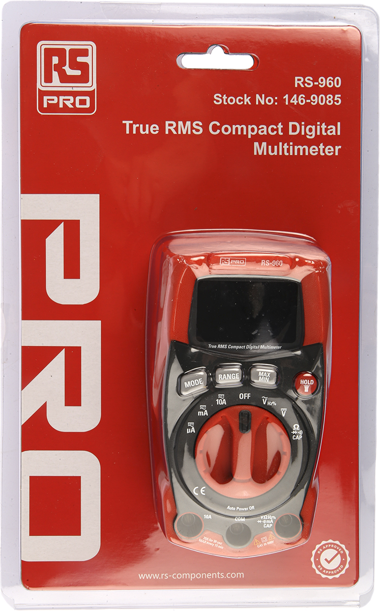 This is RS-960 Handheld Digital Multimeter 10A ac 600V ac 10A dc 600V dc manufactured by RS Pro. The manufacturer part number is 146-9085. Moreover, the product gets power from battery. Furthermore, the product is 45 mm wide. It has a True RMS feature yes . It has a model number rs-960. It features 10khz of maximum frequency. This aaa battery is comparatively much efficient than common batteries. multimeter is a versatile product designed to provide user-defined applications. Moreover, its safety category level is cat iii . Its accurate length is 70mm. It features a remarkable digital display. The typical product's weight is 255g. Its safety category voltage is 600v . It has a standard handheld type multimeter . In addition, the height is 135mm. Moreover, it has an ac voltage, dc voltage, resistance, ac current, dc current, capacitance functions measured .