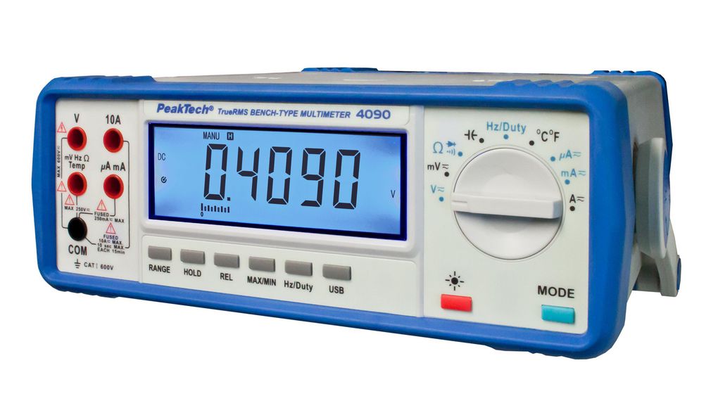 This is Bench Digital Multimeter 10A ac Max 10A dc Max 600V ac Max manufactured by PeakTech. The manufacturer part number is P4090. The product has an absolute maximum 10a dc current measurement . It features a remarkable digital display. Additionally, it has an absolute maximum 600v ac voltage measurement . While it has p4090 of model number. It has a standard bench type multimeter . Moreover, it has an absolute maximum 0.22v dc voltage measurement . It has an absolute maximum 10a ac current measurement . Additionally, it has an absolute maximum capacitance measurement of 22mf . Whereas, the absolute maximum temperature measurement is +1000°c . Moreover, it has an absolute maximum 220mω resistance measurement . Moreover, it has an ac current, ac voltage, battery test, dc current, dc voltage, diode, resistance, temperature functions measured .