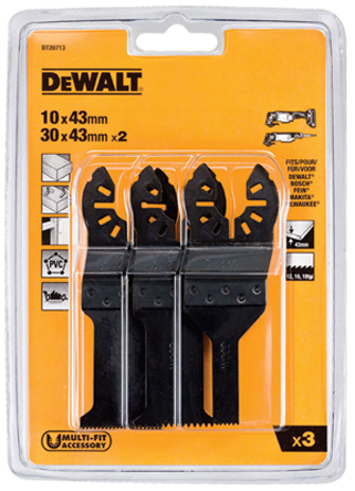 This is Dewalt 3 piece Blade Kit manufactured by DeWALT. The manufacturer part number is DT20713-QZ. The product is highly suitable for multi-cutter. It includes a multitool such as multi cutter . It has a/an oscillating blade set type multitool accessory . The product consists of 3 pieces.