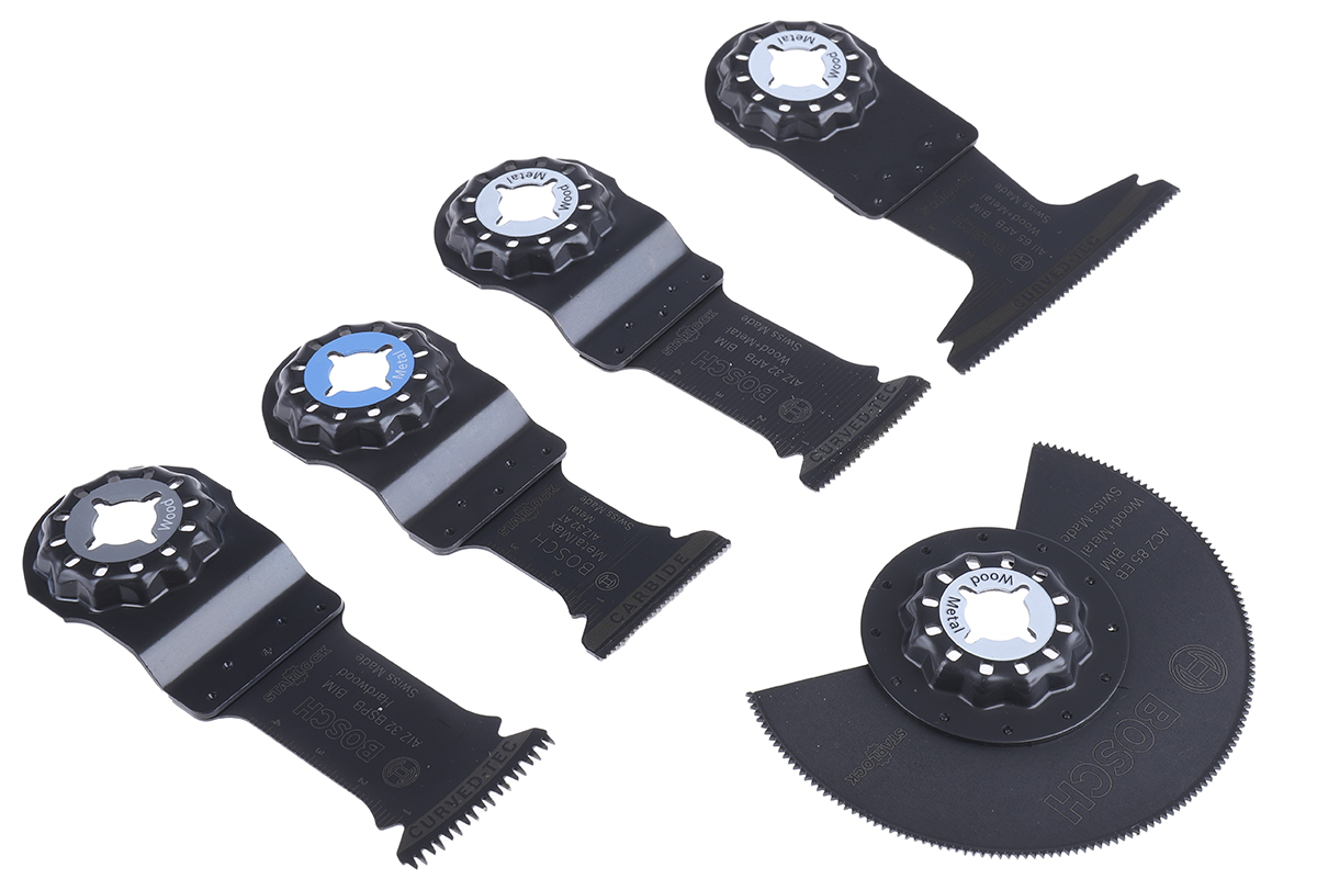 This is bimetal Oscillating Saw Blade Set manufactured by Bosch. The manufacturer part number is 2608664131. The product is highly suitable for oscillating multi tool. It has a/an oscillating blade set type multitool accessory . The product consists of 5 pieces.
