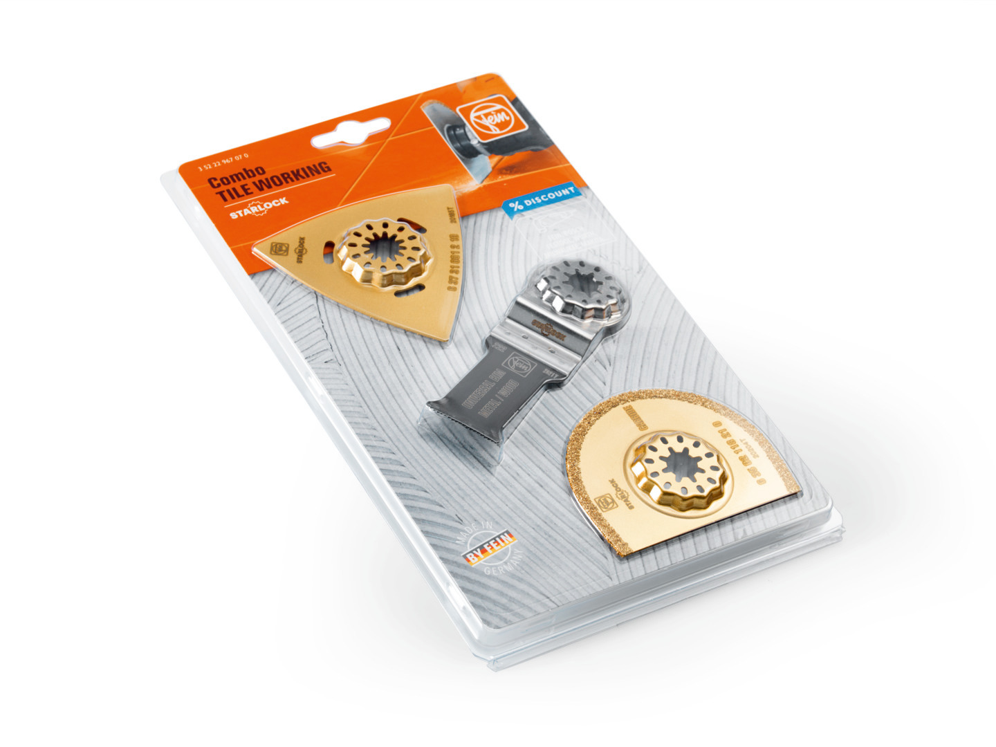 This is 3 piece Oscillating Blade Set for use with Multitools with star lock mounting manufactured by FEIN. The manufacturer part number is 35222967070. The product is highly suitable for multitools with star lock mounting. It includes a multitool such as multi cutter . It has a/an oscillating blade set type multitool accessory . The product consists of 3 pieces.