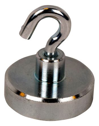 This is 16mm Hook Neodymium Magnet manufactured by Eclipse. The manufacturer part number is E1032/NEO. Additionally, it has a hook type attachment . It has a standard 16mm width/diameter . It has about 9.5kg pull force . It is 4.5mm thick. It has a typical thread size of m4. Its accurate length is 20.5mm. It has a shallow pot type magnet .