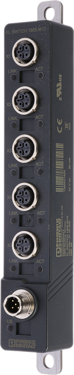 This is Phoenix Contact Ethernet Switch The manufacturer part number is 2700200. The given dimensions of the product include 30 x 200 x 41mm. It includes 5 RJ45 ports . The product fl switch 1605 m12, is a highly preferred choice for users. This product features 5 number of ports. In addition, the height is 200mm. Furthermore, the product is 30mm wide. The product comes in 41mm depth. Quality product with a unmanaged switch type. It is assigned with possible HTSUS value of 8517.62.0020. The product is rohs compliant. The product has -40°c ~ 70°c operating temperature range. The possible product's input voltage is 18 ~ 32vdc. It comes in switch - unmanaged configuration. Has copper type - 10/100. The product is available in fixed configuration. It is shipped in bulk package . m12 Connector type offer robust functionality. Its typical moisture sensitivity level is 1 (unlimited). It has a long 7 weeks standard lead time. It is IP rated with ip67. The product is available in chassis mount configuration. Consists 5 copper ports. The product is designated with the 5a002a1 code number.