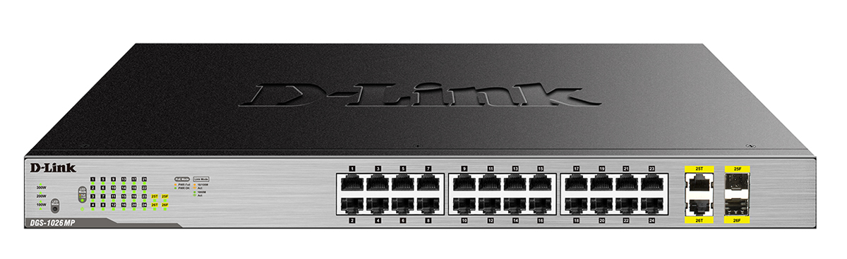 This is 26 Port Gigabit Ethernet Switch manufactured by D-Link. The manufacturer part number is DGS-1026MP. The given dimensions of the product include 440 x 262 x 44mm. It includes 26 RJ45 ports . It has a gigabit network speed class . This product features 26 number of ports. In addition, the height is 44mm. It has a power over ethernet PoE feature included yes . Furthermore, the product is 440mm wide. The product comes in 262mm depth. It has a model 26 port gigabit max poe switch. It is offered with 2 SFP ports . It is designed with 10/100/1000mbit/s of network speed . Quality product with a unmanaged switch type.