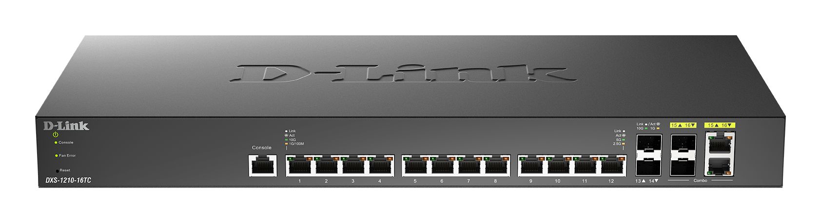 This is DXS-1210-16TC Managed Smart 16 Port Smart Switch EU manufactured by D-Link. The manufacturer part number is DXS-1210-16TC/E. The given dimensions of the product include 440 x 210 x 44mm. It includes 14 RJ45 ports . It has a gigabit network speed class . The product dxs-1210 series, is a highly preferred choice for users. This product features 16 number of ports. The plug is a highly reliable eu with long service life. In addition, the height is 44mm. It has a power over ethernet PoE feature included no . Furthermore, the product is 440mm wide. The product comes in 210mm depth. It has a model 16-port 10g multi-gigabit smart managed switch. It is offered with 4 SFP ports . It is designed with 10/100/1000/2500/10000mbit/s of network speed . Quality product with a smart switch type.