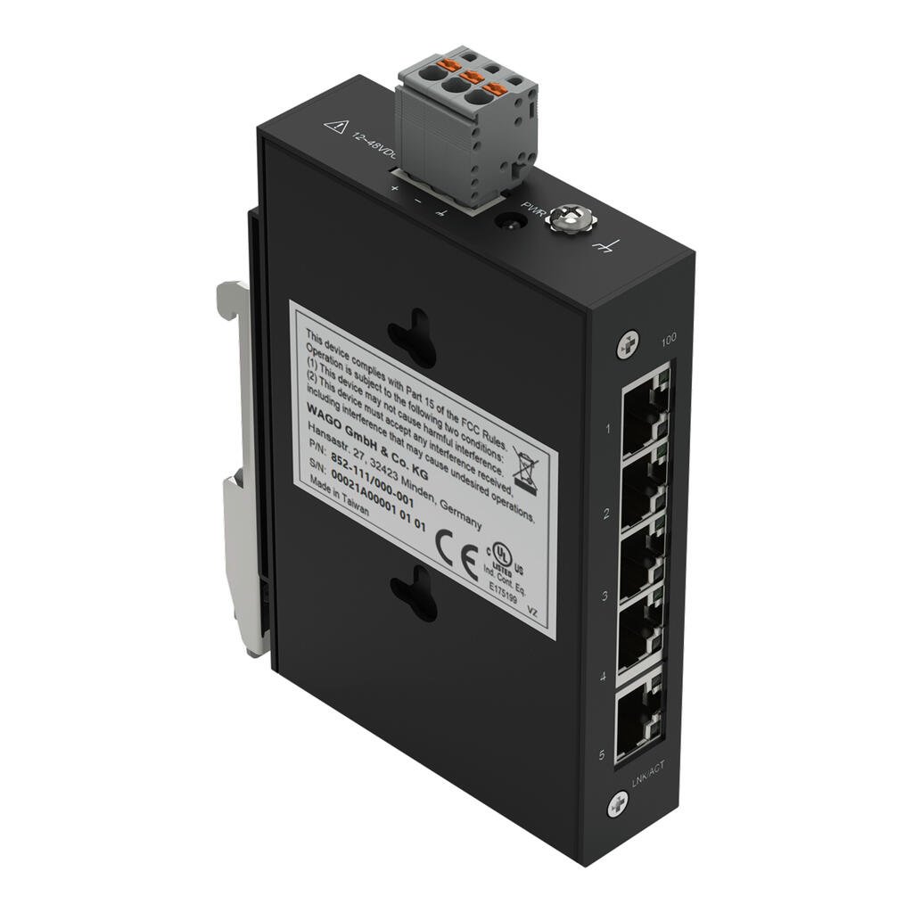This is 852 Unmanaged 5 Port Network Switch RJ-45 manufactured by WAGO. The manufacturer part number is 852-111/000-001. It has a power over ethernet PoE feature included no . This product features 5 number of ports. It has a model 852. The plug is a highly reliable rj-45 with long service life. Quality product with a unmanaged switch type.