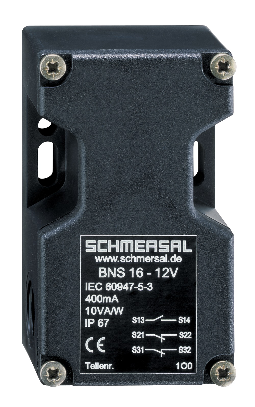 This is BNS16 Magnetic Safety Switch Coded Actuator Plastic 100 V ac/dc manufactured by Schmersal. The manufacturer part number is BNS 16-12ZR. It provides robust safety and is complied with 4 safety category. The product complies with all safety standards, such as bg, bg-gs-et-14, ce, culus listed, eac, en iso 13849-1, iec 60947-5-3, tuv approval. It is IP rated with ip67. The product bns16, is a highly preferred choice for users. It switching distance is approximately 8 (on) mm, 18 (off) mm . Its accurate length is 90mm. It includes an actuator no . The product also features robust plastic housing material. Furthermore, the product is 52mm wide. The product comes in 38.5mm depth. Features 100v ac/dc supply voltage. The product carries coded actuator. It has a/an magnetic sensor principle . It allows m20 connection type.
