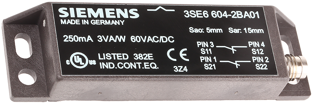 This is Sirius 3SE6 Magnetic Safety Switch Coded Unique Coded Actuator Plastic 100 V manufactured by Siemens. The manufacturer part number is 3SE6604-2BA01. The product carries unique coded actuator. It is IP rated with ip67. The product 3se6, is a highly preferred choice for users. It switching distance is approximately 15 mm . Its accurate length is 88mm. It includes an actuator no . The product also features robust plastic housing material. Furthermore, the product is 25mm wide. The product comes in 13mm depth. Features 60v ac/dc supply voltage. It features sirius range. It has a/an magnetic sensor principle . It provides robust safety and is complied with 4 safety category.