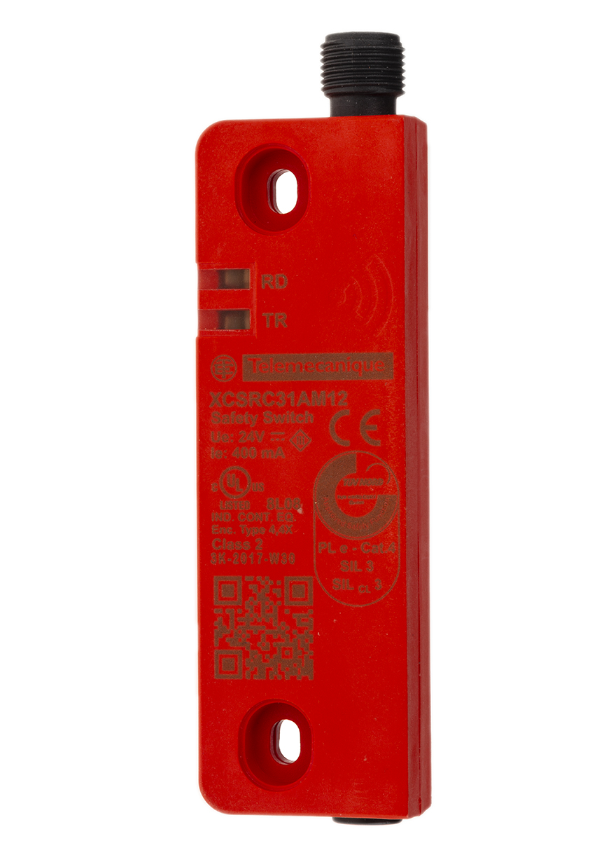 This is Preventa XCSRC RFID Safety Switch Valox 24 V dc manufactured by Telemecanique Sensors. The manufacturer part number is XCSRC31AM12. It provides robust safety and is complied with 4 safety category. It has 3 approach directions . It includes 2no safety contacts . It is IP rated with ip65, ip66, ip67, ip69k. The product xcsrc, is a highly preferred choice for users. It switching distance is approximately 10 mm . Its accurate length is 45mm. It includes an actuator yes . The product also features robust valox housing material. Furthermore, the product is 15mm wide. The product comes in 108.3mm depth. Features 24v dc supply voltage. It features preventa range. It has a/an rfid sensor principle . It features 60ma supply current. It allows m12 connection type.