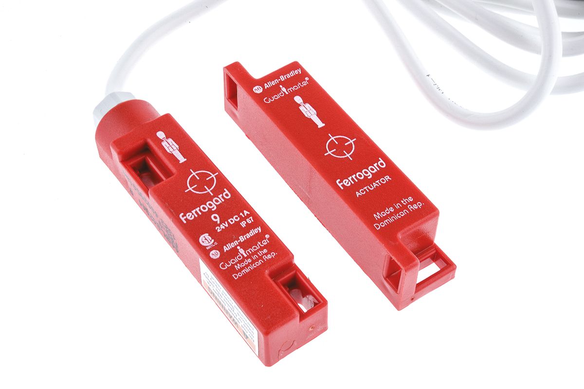 Allen Bradley Guardmaster Ferrogard 6, 9 & 10 Slim Non Contact Safety Switch Enhance the safety and security of your machine guards and provide essential protection for personnel with the Ferrogard FRS, 6 9 and 10 by Allen Bradley Guardmaster. These magnetically actuated non-contact safety switches are specially designed to be installed on guard doors and work by immediately cutting off the power supply to a machine when the safety guard or gate is opened, thereby restricting unsafe access for personnel to a hazardous area. The magnetic actuator is removed from the switch when the door is released, which then opens the NC safety contacts. They offer reliability and a high tolerance to misalignment due to their large sensing field. These switches are dust-tight and are highly suitable for wet environments as they are sealed to IP67 (NEMA 6P). With two active sensing faces, they offer a wider range of mounting options for your convenience. This switch is moulded in ABS plastic with a slim rectangular housing, making it perfect for narrow mounting areas. Features and Benefits: Slim housings, well suited to narrow mounting areas and two active sensing faces permitting more flexible mounting options Non-contact actuation, which allows the machine guard to be opened immediately Operating distance for safety contacts: make 12mm; break 23mm Operating temperature range: -10°C to +65°C M4 mounting Cat. 1 Device per EN954-1 Dual channel interlocks suitable for Cat. 3 or 4 systems Approvals: CE Marked for all applicable directives and cULus, UL, CSA Standards: EN954-1, ISO13849-1, IEC/EN60204-1, NFPA79, EN1088, ISO14119, ANSI B11.19, AS4024.1.