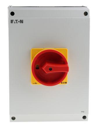 This is 6 Pole Enclosed Non Fused Isolator Switch NO 100 A 30 kW IP65 manufactured by Eaton. The manufacturer part number is T5-4-15682/I5/SVB. It also carries 100 a maximum current. Moreover, it is designed with 1850 a switch rating . The product is available in enclosed configuration. It is IP rated with ip65. It accepts padlocks yes . It has a maximum operating temperature of +50°c. Whereas, the minimum operating temperature of the product is -25°c. Moreover, the product has a nominal 415 v ac voltage rating. Its accurate length is 280mm. In addition, it has a single throw configuration . Furthermore, the product is 200mm wide. The product comes in 125mm depth. It has auxiliary available contacts yes . The normal state configuration includes no. Feature 30 kw of power rating. It has equipped with 6 poles. The terminal is a screw type. Its handle is of red colour .