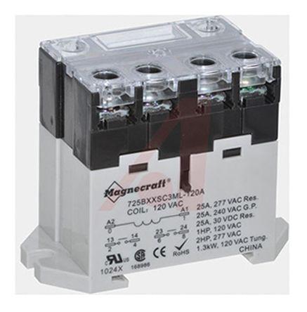 This is DPNO DIN Rail Non-Latching Relay 120V ac Coil 25 A manufactured by Schneider Electric. The manufacturer part number is 725BXXSC3ML-120A. The given dimensions of the product include 67.7 x 33.1 x 53.2mm. The coil voltage of the product is 120 v ac. Applications Information involves power. It holds up to 5.2 kω coil resistance. It is capable of doing 6000 (electrical) cycles, 5000000 (mechanical) operations in a lifetime . Robust coil power of 2.5w. While it carries 30v of maximum DC switching voltage. It bears a maximum 500 mw of DC switching power. The product has 4kv rms isolation coil to contact. It has a maximum operating temperature of +55°c. The terminal is a screw type. It has a maximum 25 a switching current AC . The product has -20 → +55°c of operating temperature range. The contact is equipped with dpno configuration. The product comes in 33.1mm depth. The product is available in din rail configuration. Its accurate length is 67.7mm. In addition, the height is 53.2mm. It has a minimum 25 a DC switching current . It has a maximum AC switching voltage of 300v. Whereas, the minimum operating temperature of the product is -20°c. The product is made from sturdy silver alloy materials.