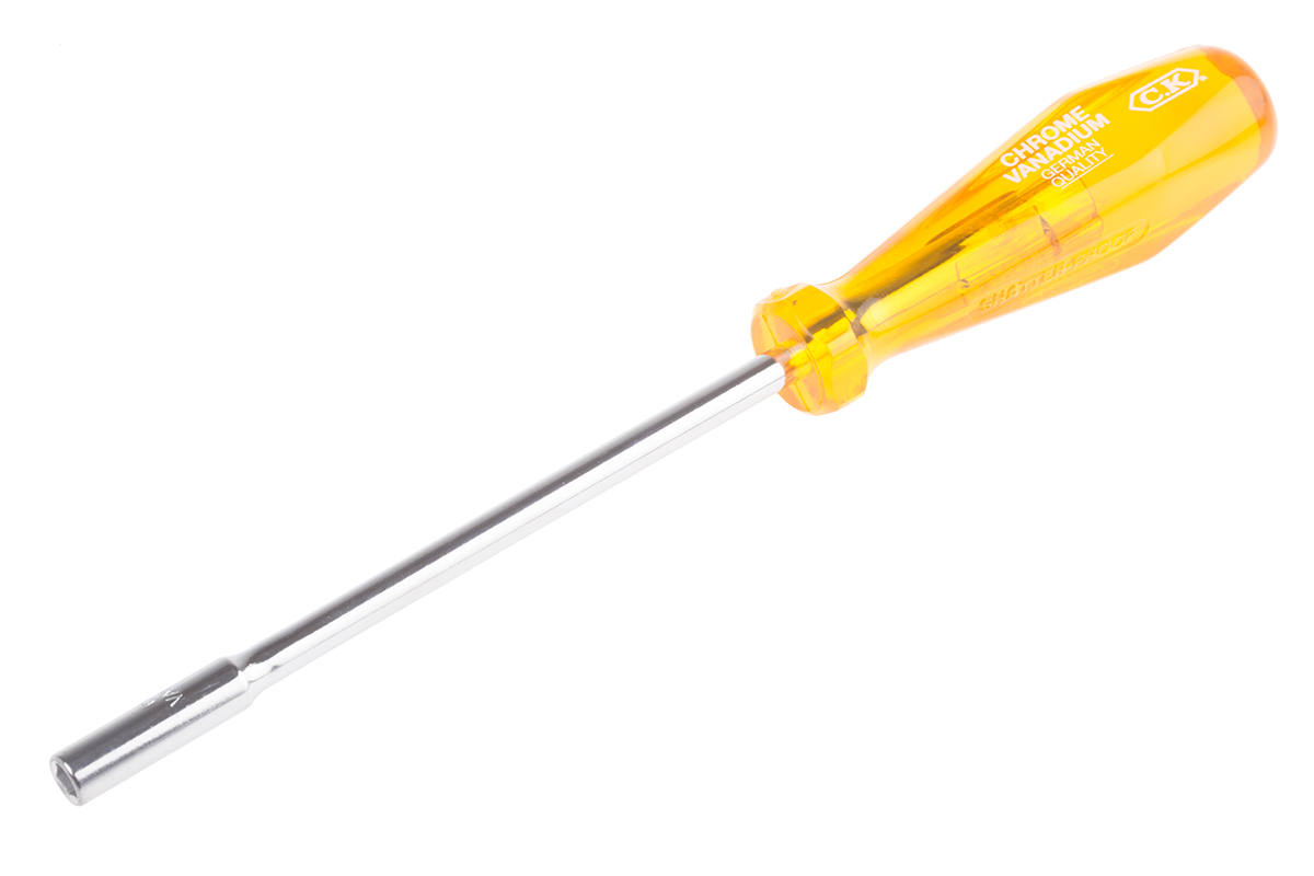 This is Alloy Steel Screwdriver Nut Spinner 5 mm Tip Cellulose Acetate manufactured by CK. The manufacturer part number is T4334M 05. The tip is 5 mm in size. Its comfortable handle is manufactured from durable plastic material. In addition, it has a chrome blade finish . The blade has a length of 215 mm. The built-in exquisite tip is a hexagon tip. In addition, its blade is made up of alloy steel material .
