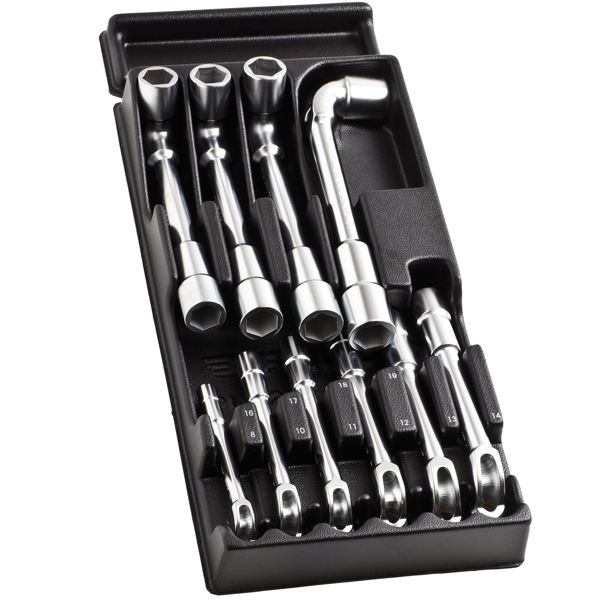 This is 10 Pieces Metric Socket Spanner Set manufactured by Facom. The manufacturer part number is MOD.75-1PB. VDE/1000V Approval Options - no. The tip is 8 - 10 - 11 - 12 - 13 - 14 - 16 - 17 - 18 - 19 mm in size. Basically, this handle is a type of tube, allowing extreme comfort. It has a non sparking nature no . In addition, it has a chrome satin blade finish . Its comfortable handle is manufactured from durable chrome vanadium material. The built-in exquisite tip is a hex tip. In addition, its blade is made up of chrome vanadium material .