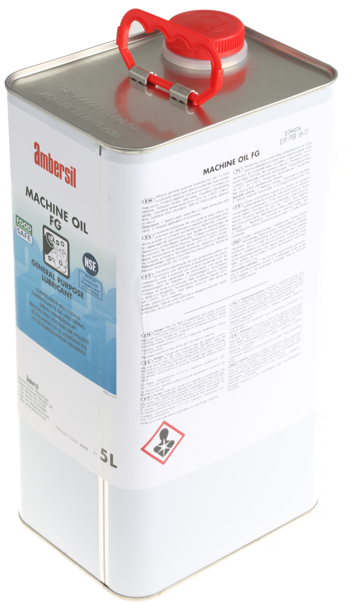 This is 5 L Can Machine Oil for Industrial Machinery manufactured by Ambersil. The manufacturer part number is 31649-AA. It is assigned with a trade name of machine oil fg. Its package size is approximately 5 l . The package is a sort of can. Applications Information involves industrial machinery.