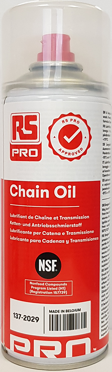 This is Chain oil 400ml manufactured by RS Pro. The manufacturer part number is 137-2029. It is assigned with a trade name of chain lubricant. Its package size is approximately 400 ml . The package is a sort of aerosol. Applications Information involves food industry, general purpose.