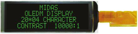 This is Green Passive matrix OLED Display TAB I2C Parallel SPI Interface manufactured by Midas. The manufacturer part number is MCOT42005AX-EGM. Its contrast ratio is >10000:1 . It has a/an green colour display . The given dimensions of the product include 84.5 x 27.5 x 2mm. Moreover, it has a i2c, parallel, spi interface ports . The product has -40 → +85°c of operating temperature range. It has a maximum operating temperature of +85°c. It has a/an passive type matrix . It has a 72.42mm width of viewing area . In addition, it has a standard 22.82mm height of viewing area . In addition, the height is 27.5mm. It has a tab mounting driver . Furthermore, the product is 84.5mm wide. The product comes in 2mm depth. Whereas, the minimum operating temperature of the product is -40°c. It has approximately 72.42 x 22.82mm viewing area dimensions .