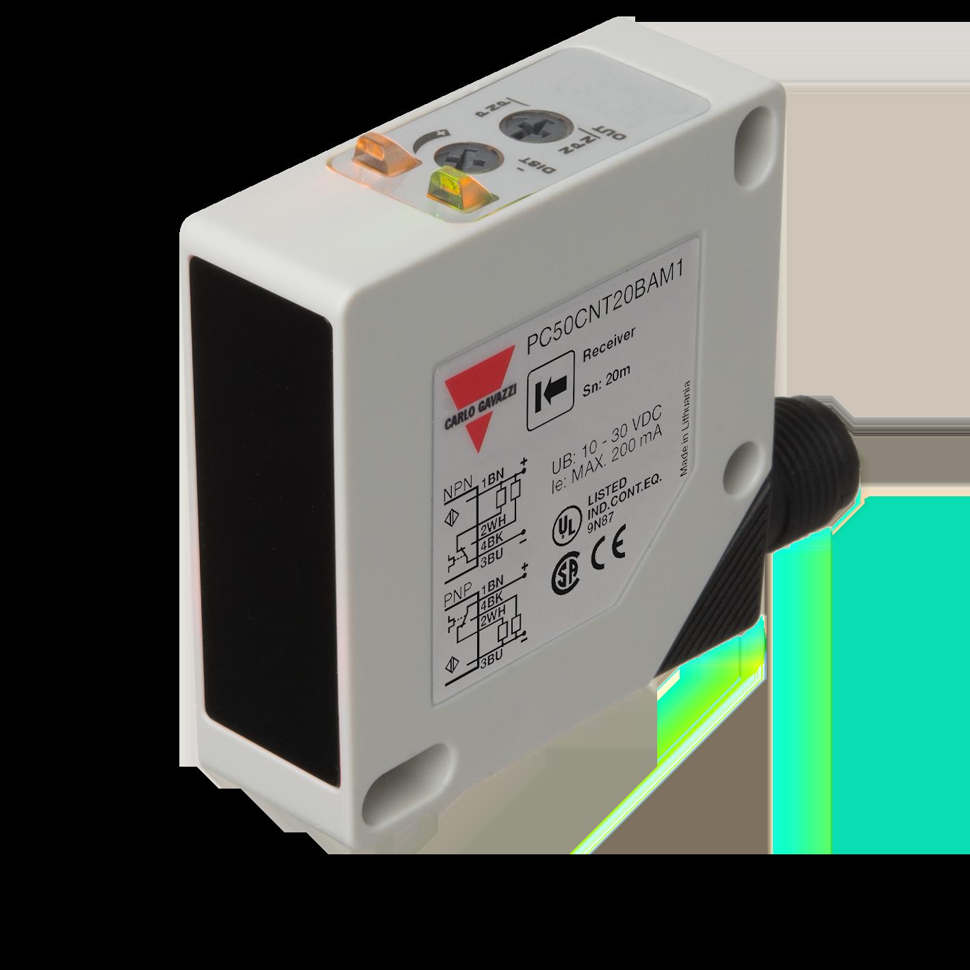 This is manufactured by Carlo Gavazzi Inc.. The manufacturer part number is PC50CNT20BAM1. It is assigned with possible HTSUS value of 8541.49.8000. The product is rohs3 compliant. The product has -20°c ~ 60°c operating temperature range. It has adjustment flexibility and is adjusted at a adjustable, 1-turn potentiometer. The product offers connector connection mechanism. In addition, it is reach unaffected. Equipped with through-beam sensing mechanism. It features a 787.4" (20m) of sensing distance. It responds within 1ms. The carlo gavazzi inc.'s product offers user-desired applications. Its typical moisture sensitivity level is not applicable. It has a long 12 weeks standard lead time. It is IP rated with ip67. In addition, box is the available packaging type of the product. It has optimum voltage supply of 10v ~ 30v. It boasts npn/pnp output configuration. The product is designated with the ear99 code number. Moreover, it corresponds to pc50cnt20, a base product number of the product. Uses infrared (950nm) as a light source.