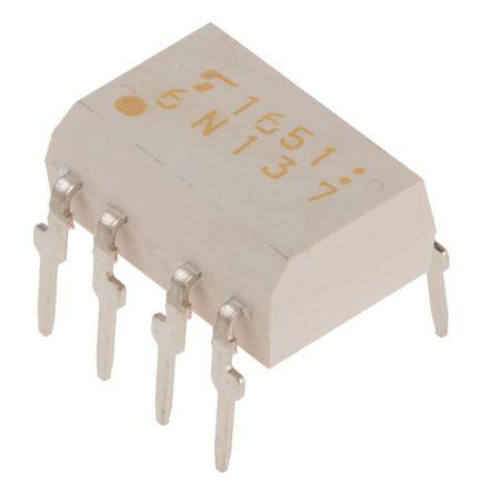 This is DC Input Transistor Output Optocoupler Through Hole 8-Pin DIP manufactured by Toshiba. The manufacturer part number is 6N137(F). It also carries 1.75v of maximum forward voltage. Its output device includes transistor. It has 2.5 kvrms isolation voltage. The product is available in through hole configuration. It has a typical 30ns rise time . In addition, it has a minimum 1000 % current transfer ratio . It has a maximum 1000% current transfer ratio . Its input is of dc type . It is comprised of 8 pins. It is supplied with 1 channels. The package is a sort of dip. While its maximum input current includes 20 ma. It includes a logic output yes . It has a typical 30ns fall time .