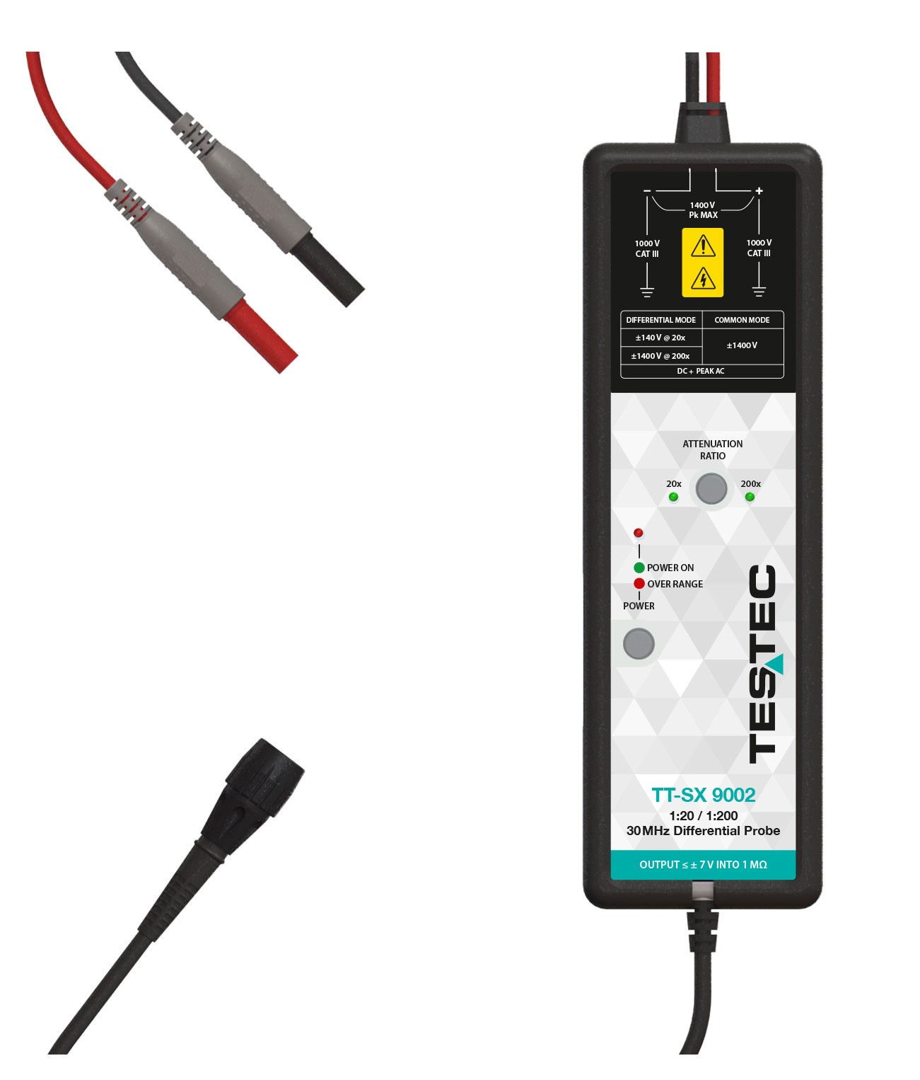 This is TT-SX 9000 Series TT-SX 9002 Oscilloscope Probe Active Differential Type 30MHz 1:20 1:200 1400V Max manufactured by Testec. The manufacturer part number is 15602. The probe is basically a active, differential probe. It has a maximum 1400v common mode input voltage . Its attenuation is about 1:20, 1:200 . Moreover, its safety category level is cat iii . The product tt-sx 9000, is a highly preferred choice for users. Its safety category voltage is 1000v . While it has tt-sx 9002 of model number. bnc Connector type offer robust functionality. It provides robust safety and is complied with iec61010-031:2015 safety category. Has 30mhz bandwidth. Whereas, the rise time is 14ns . It has 1 probes included .