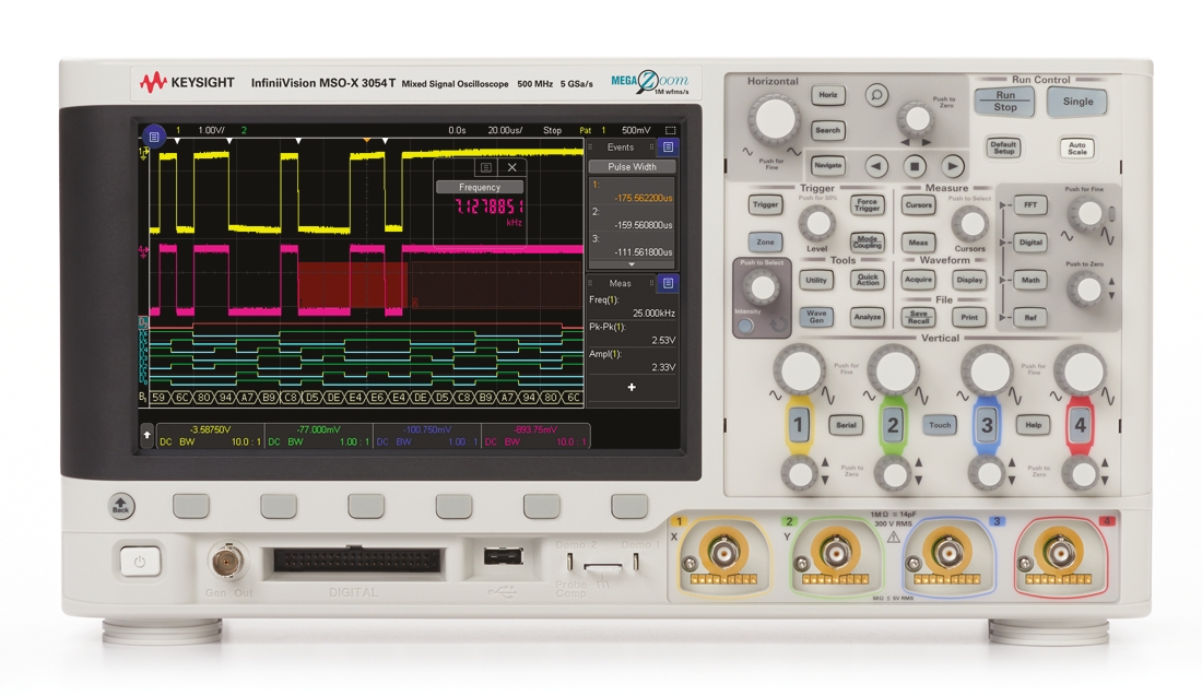 This is Mixed Signal Oscilloscope 4 Analogue. Ch. 16 Digital. Ch. 500MHz manufactured by Keysight Technologies. The manufacturer part number is MSOX3054T. The given dimensions of the product include 381 x 142 x 204mm. Moreover, the product gets power from mains. Whereas, its minimum time base is 1ns/div . It includes a bench type oscilloscope . Moreover, its maximum time base is 50s/div . It is digital . However, its sample rate random 2 gsps, 4 gsps . Furthermore, it has a minimum 1mv/div vertical sensitivity . It has 1 m points/ch, 2m points/ch record length . It screen is about 8.5in in size . It has 16 digital channels . A bespoke product is can, iic, lin, rs232, rs422, rs485, spi, uart, usb interface. It is calibrated rscal . It has a maximum 5v/div vertical sensitivity . It features a remarkable wvga display. Whereas, the rise time is 700ps . The typical product's weight is 3.9kg. Its vertical resolution is approximately 1 (digital) bit, 8 (analogue) bit . The product infiniivision 3000t x, is a highly preferred choice for users. It has an oscilloscope of mixed signal form . It provides robust safety and is complied with cat i safety category. Has 500mhz bandwidth. Moreover, it contains 4 analogue channels .