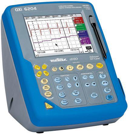 This is OXI 6204 Digital Oscilloscope 4 Channels 200MHz With UKAS Calibration manufactured by Metrix. The manufacturer part number is OXI6204. It features a remarkable tft lcd display. Its safety category voltage is 600v . However, its sample rate random 100 g samples/s . Moreover, the product gets power from mains. Whereas, its minimum time base is 1ns/div . Moreover, its safety category level is cat ii . Its vertical resolution is approximately 12 bit . While it has oxi 6204 of model number. It has a maximum 200v/div vertical sensitivity . It provides robust safety and is complied with cat ii 600 v safety category. Has 200mhz bandwidth. It is calibrated rscal . It is supplied with 4 channels. Furthermore, it has a minimum 2.5mv/div vertical sensitivity . It includes a handheld type oscilloscope . Whereas, the rise time is 1.9ns . It screen is about 5.7in in size .