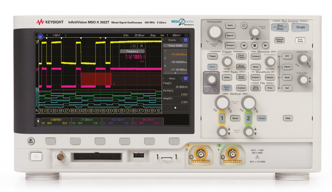 This is Mixed Signal Oscilloscope 2 Analogue. Ch. 16 Digital. Ch. 200MHz manufactured by Keysight Technologies. The manufacturer part number is MSOX3022T. The given dimensions of the product include 142 x 381 x 204mm. Moreover, the product gets power from mains. Whereas, its minimum time base is 2ns/div . It includes a bench type oscilloscope . Moreover, its maximum time base is 50s/div . It is digital . However, its sample rate random 5 gsps . Furthermore, it has a minimum 1mv/div vertical sensitivity . It has 2 (digital) m points/ch, 4 (analog) m points/ch record length . It screen is about 8.5in in size . It has 16 digital channels . A bespoke product is can, iic, lin, rs232, rs422, rs485, spi, uart, usb interface. It is calibrated rscal . It features a remarkable capacitive touch gesture-enabled display display. Whereas, the rise time is ≤1.75ns . The typical product's weight is 4kg. Its vertical resolution is approximately 8 bit . The product infiniivision 3000t x, is a highly preferred choice for users. It has an oscilloscope of mixed signal form . It provides robust safety and is complied with cat i 800v safety category. Has 200mhz bandwidth. Moreover, it contains 2 analogue channels .
